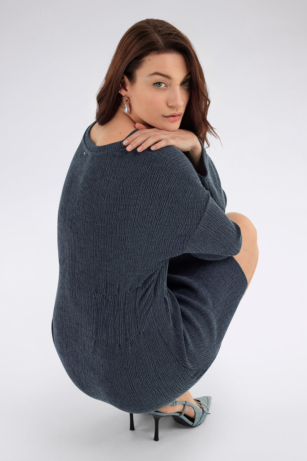 Short-sleeve fitted dress enhanced with pinces at the waist that accentuate the silhouette. Made from 100% cotton interlock jersey, it combines clean lines with a hyper-feminine allure. The metallic logo plaque on the left sleeve, with a polished nickel finish, adds a distinctive touch.