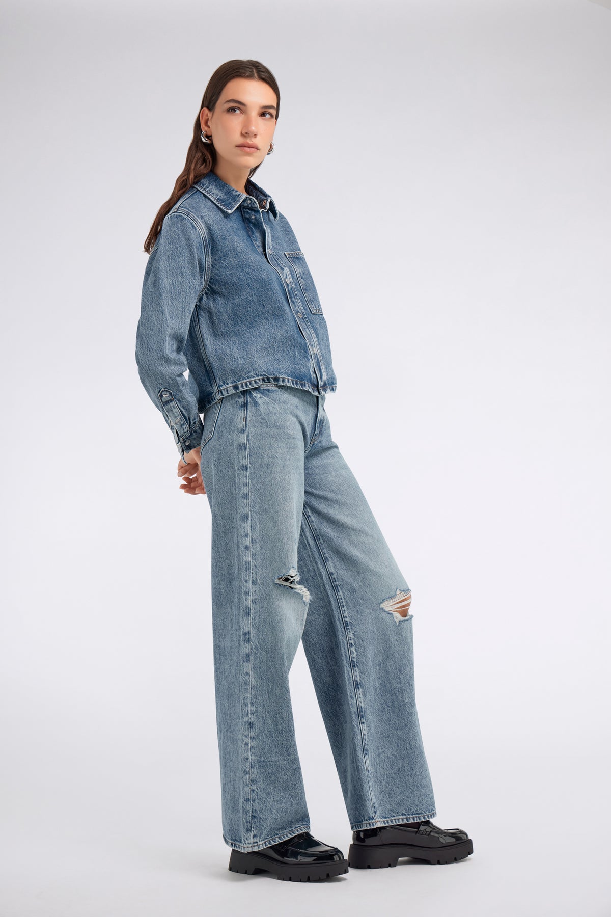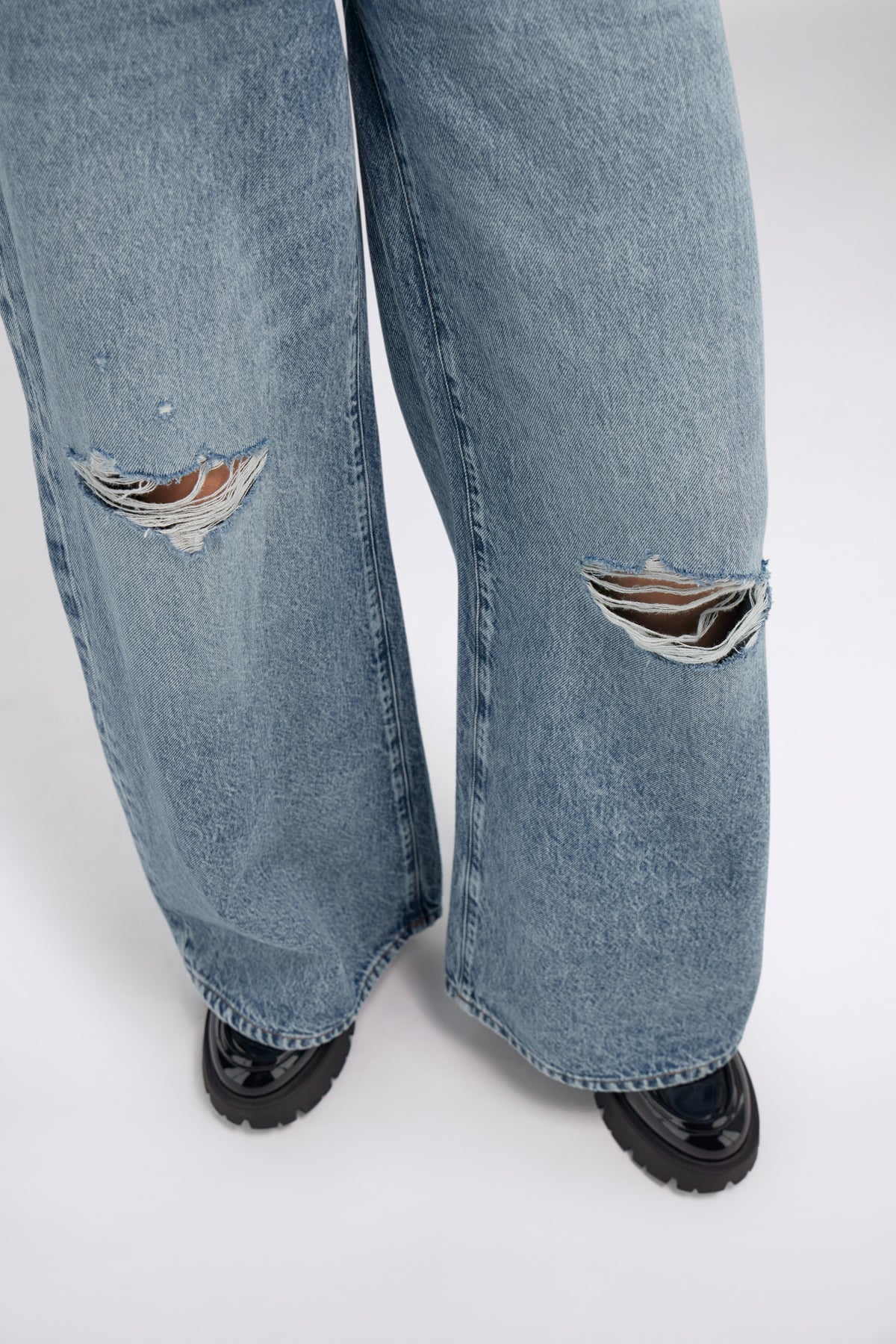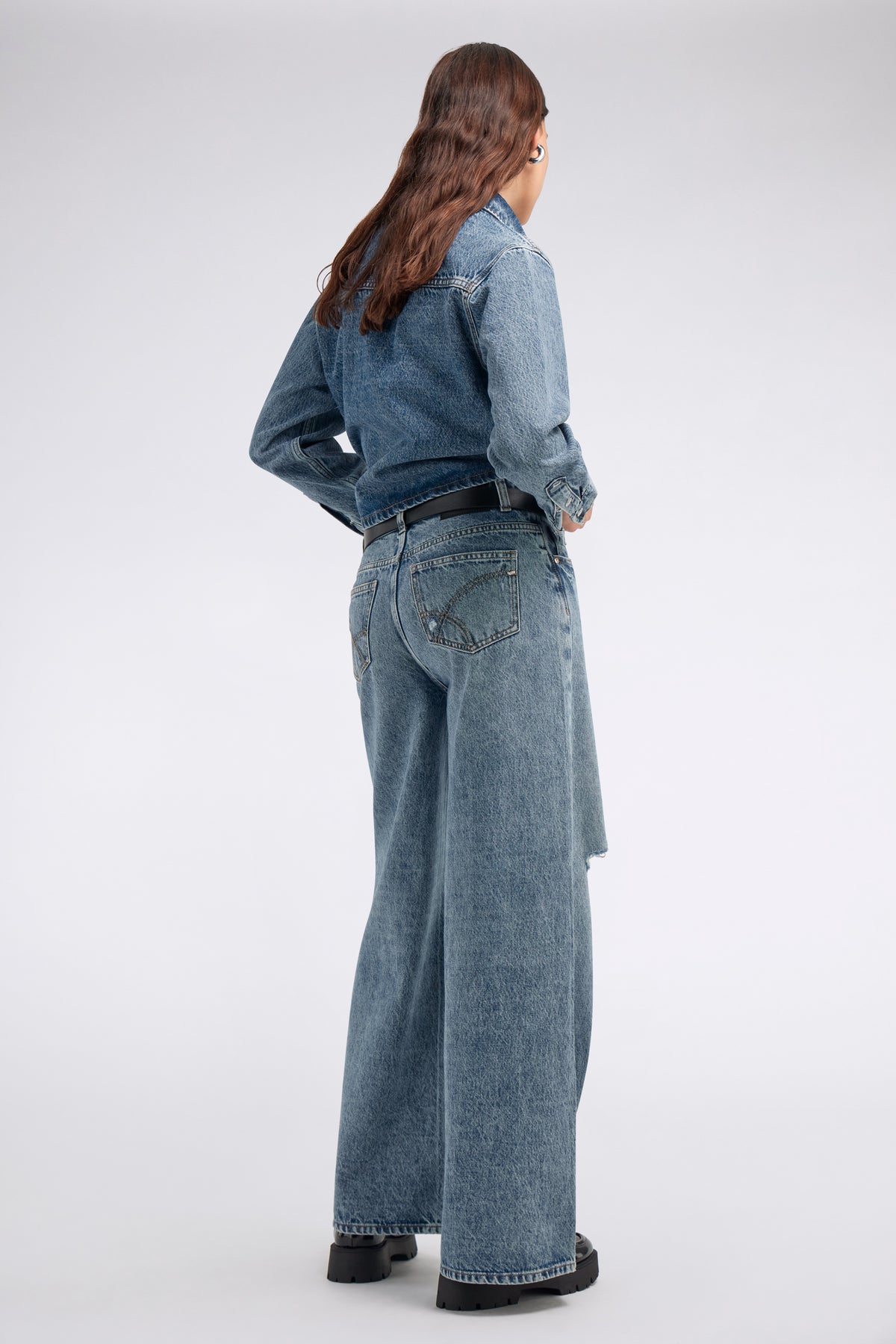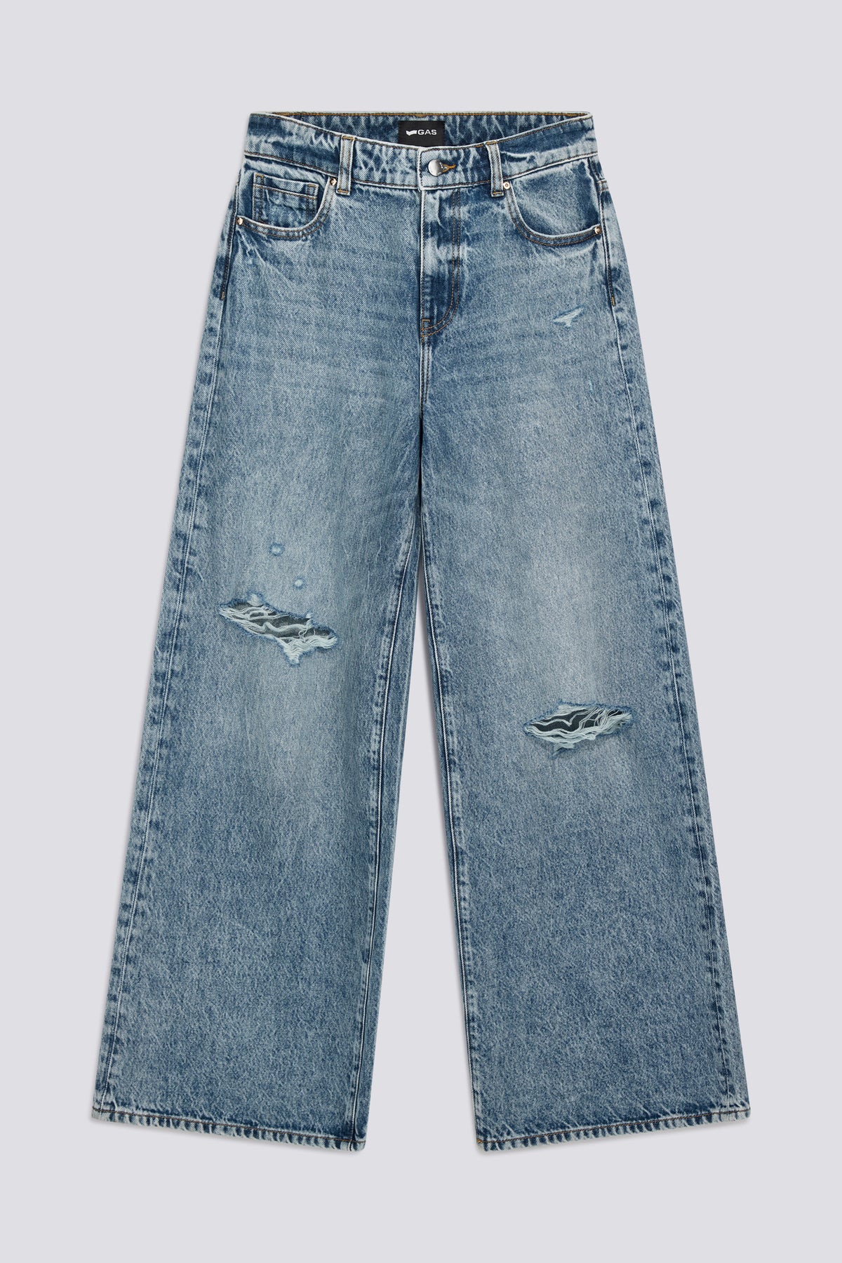 Jeans mit 5 Taschen, loose fit und niedriger Taille aus hartem Denim 11.80 OZ mit starkem Charakter. Die mittel/helle Waschung mit Bimsstein und Bruchstellen verleiht ein authentisches und getragenes Aussehen. Perfekt mit einem übergroßen Hemd für einen entspannten Look oder kombiniert mit einem strukturierten Blazer für eine lässige aber raffinierte Haltung.