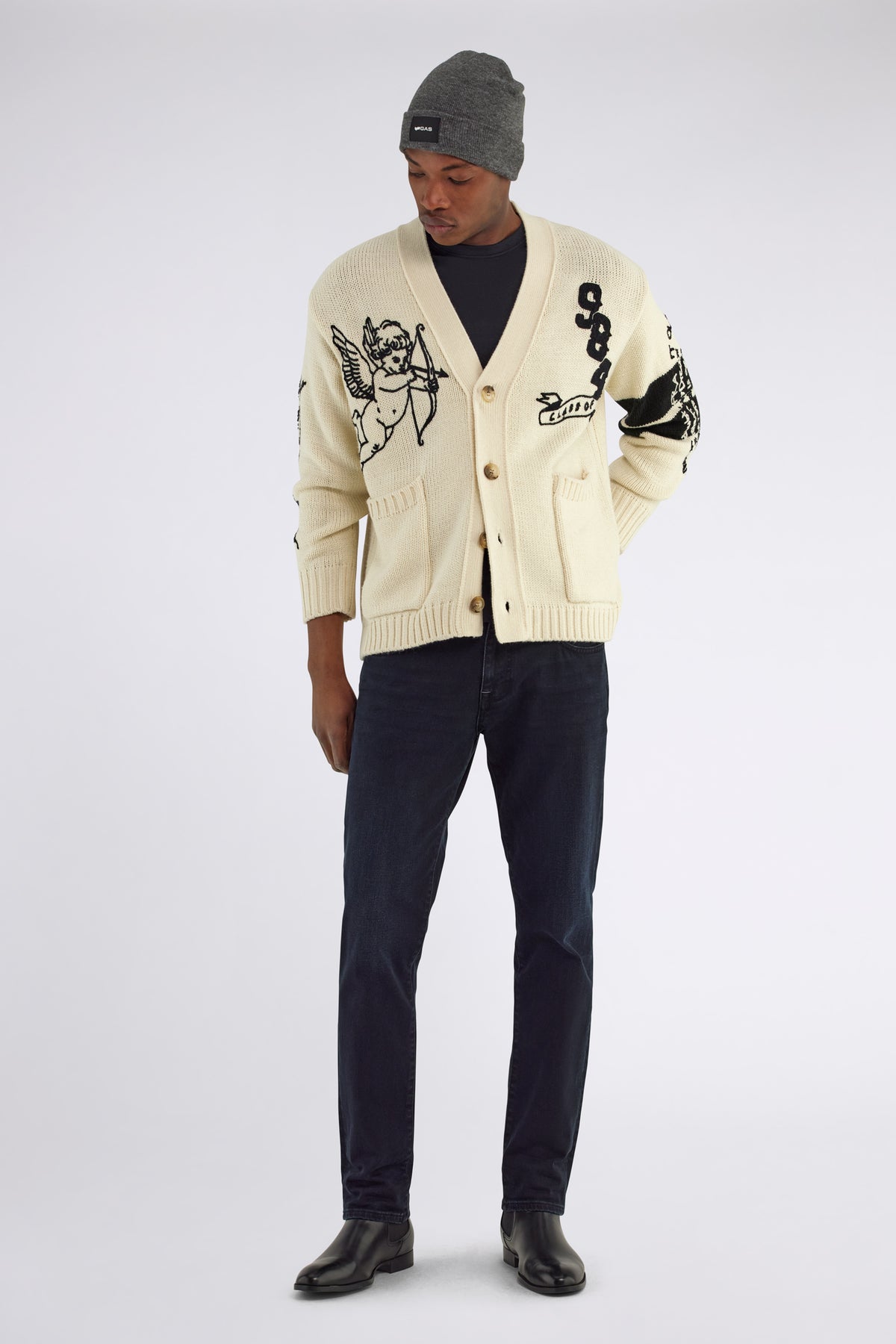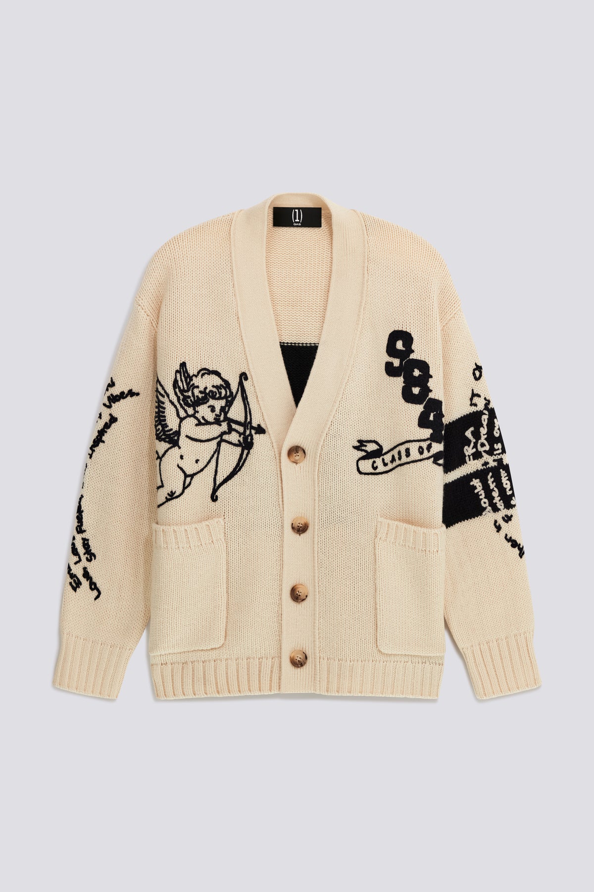 Cardigan Comfort Fit aus weichem Garn mit Feinheit 5, belebt durch grafische Intarsien und kontrastierende Stickereien, die den einzigartigen Stil betonen. Perfekt, um dem Look Persönlichkeit zu verleihen und in der kalten Jahreszeit mit Lagen und Texturen zu spielen.