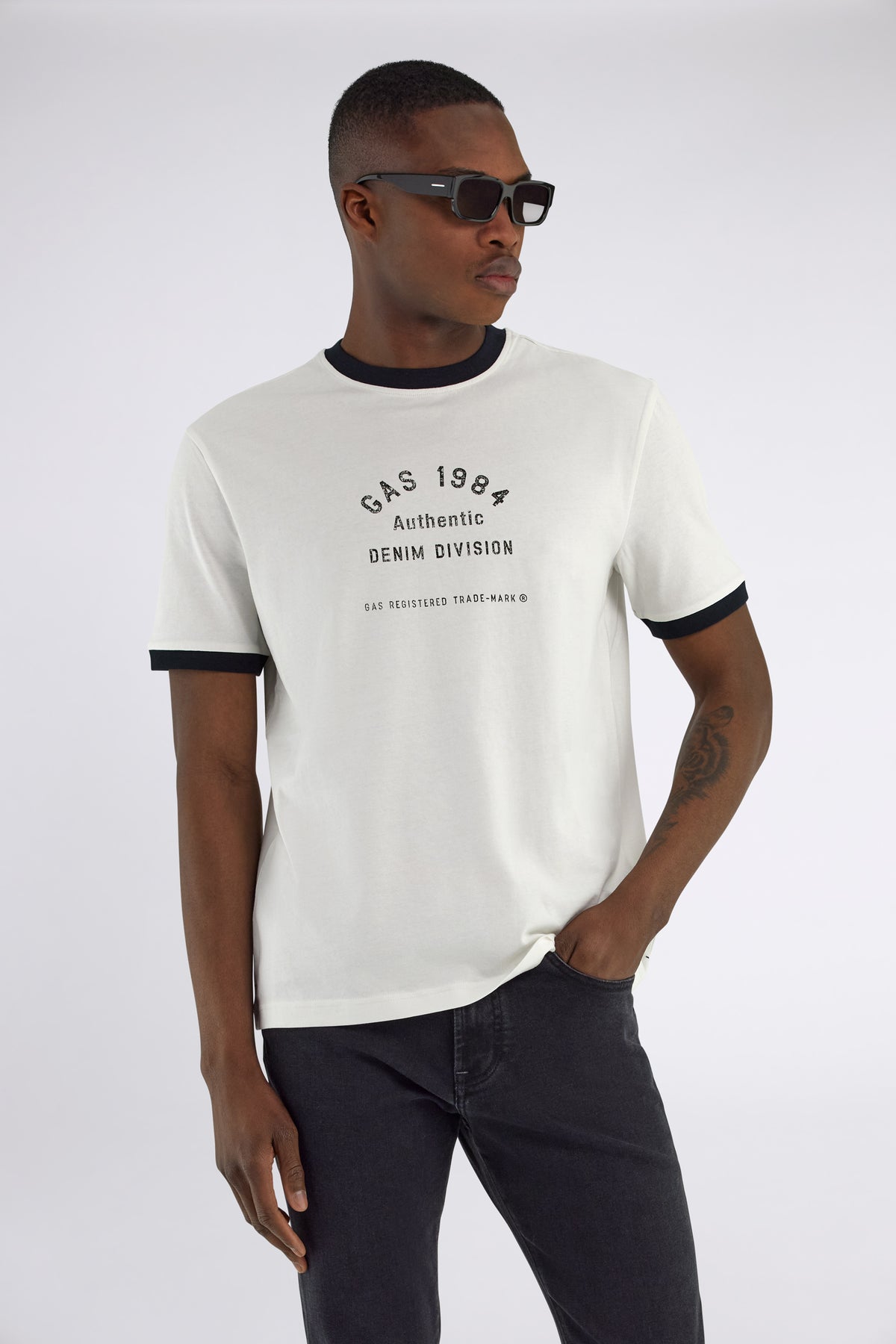 Herren T-Shirt mit kurzen Ärmeln und regulärer Passform aus leichtem Baumwolljersey. Das Frontlogo mit wasserbasierter Vintage-Printtechnik erinnert an die authentische Ästhetik des GAS-Archivs, während kontrastierende Abschlüsse an Kragen und Ärmeln einen markanten grafischen Akzent setzen.