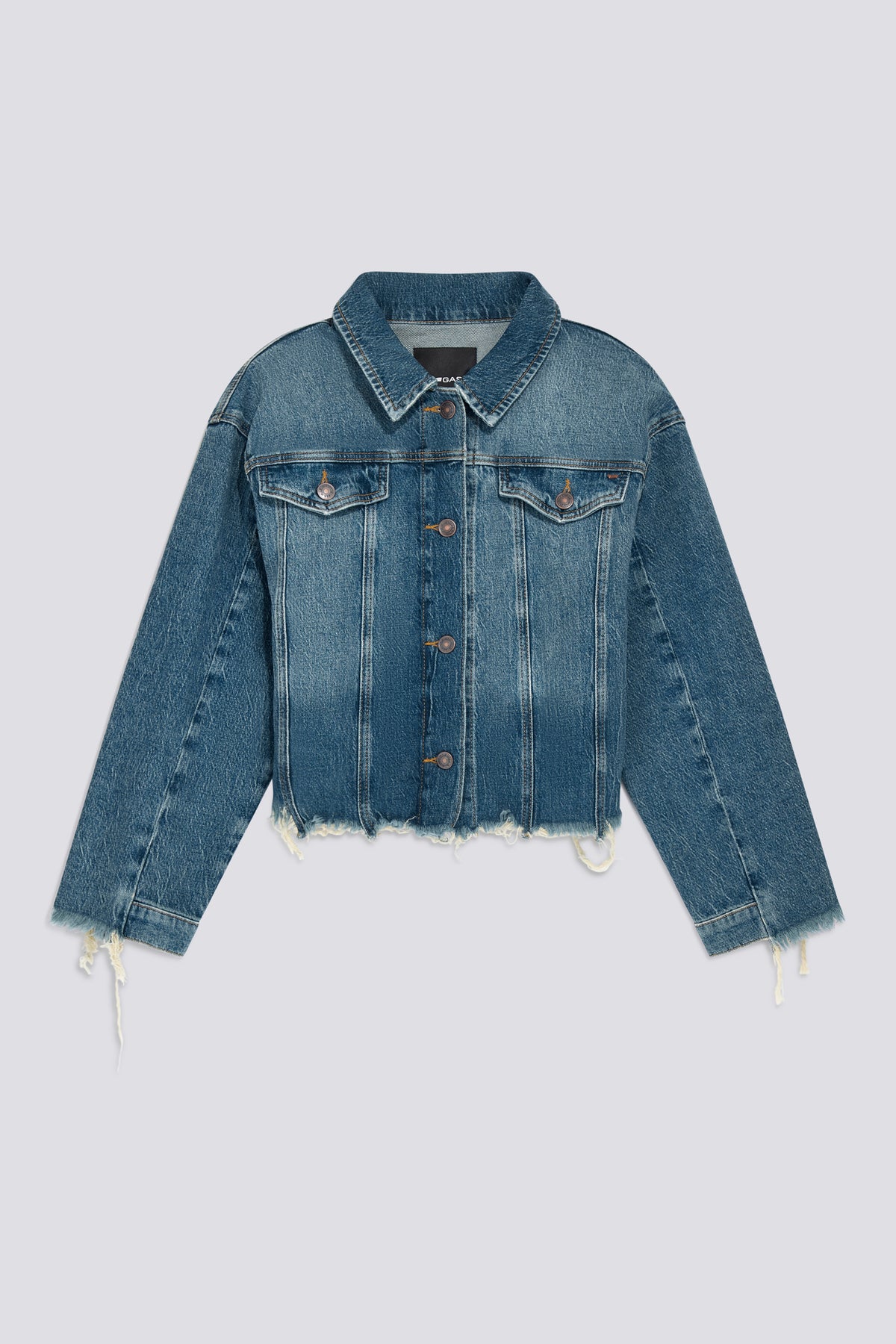 The right attitude, the fit that makes a difference. This relaxed fit denim jacket is made of 12 oz comfort indigo blue fabric, with a medium washed lived-in look achieved with pumice. The fringed hem and sleeves add a raw and contemporary touch that breaks the rules of the classic trucker. A must-have for denim-on-denim looks or to wear over light dresses for a cool and bold contrast.