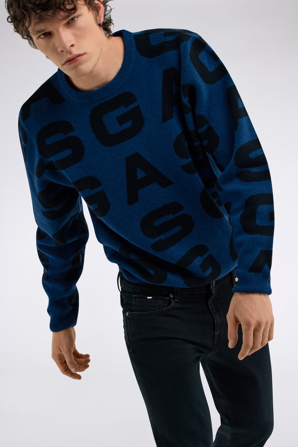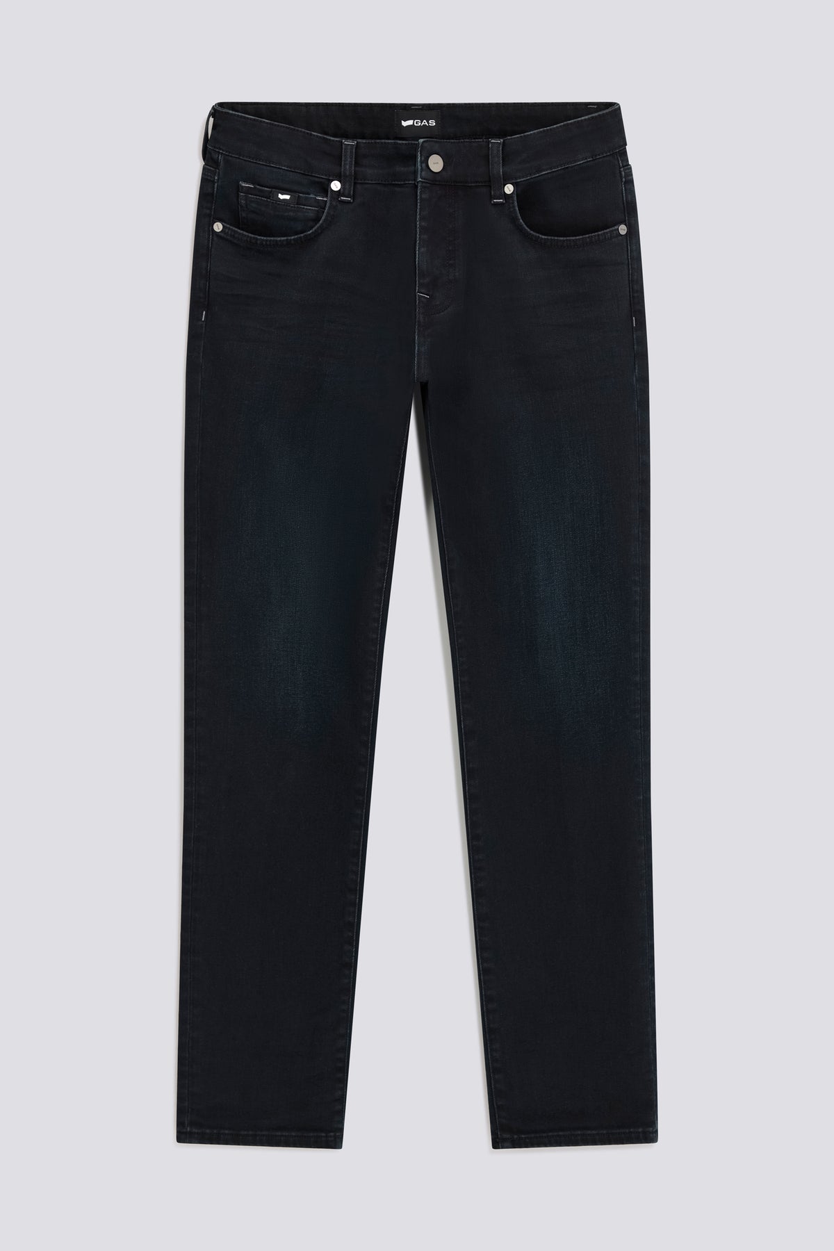 Slim fit 5-pocket jeans in premium 10 OZ tri-blend denim, blue-black high-recovery stretch for lasting comfort. The dark wash with pumice enhances its texture, while the silicone detail on the back pockets adds a distinctive graphic touch.