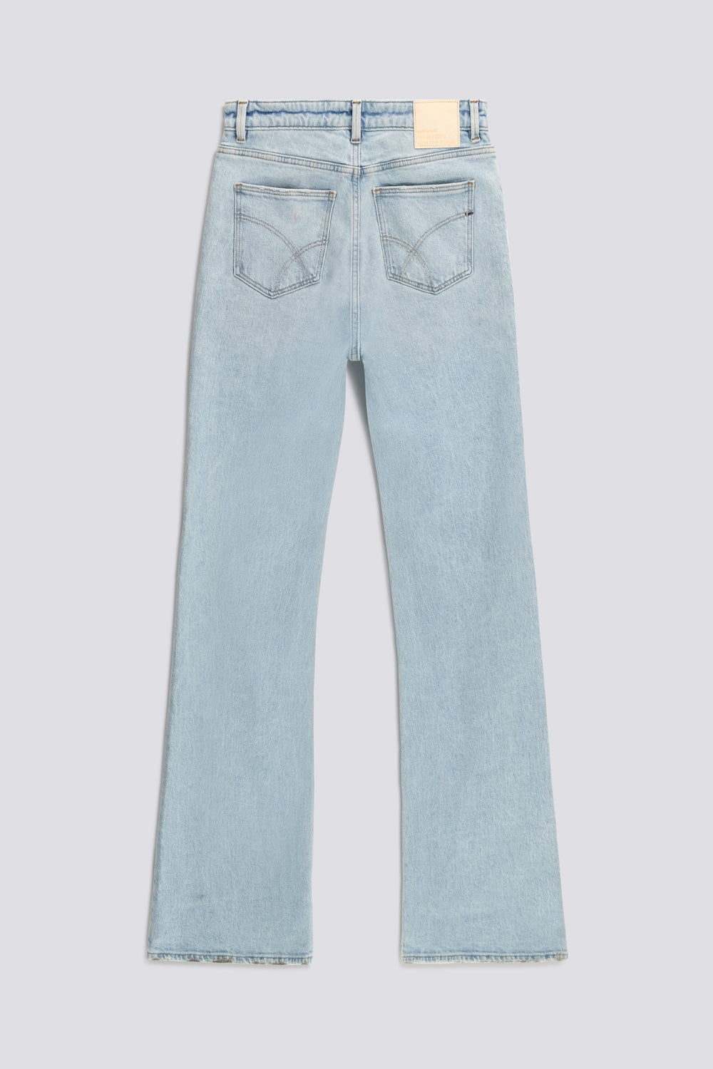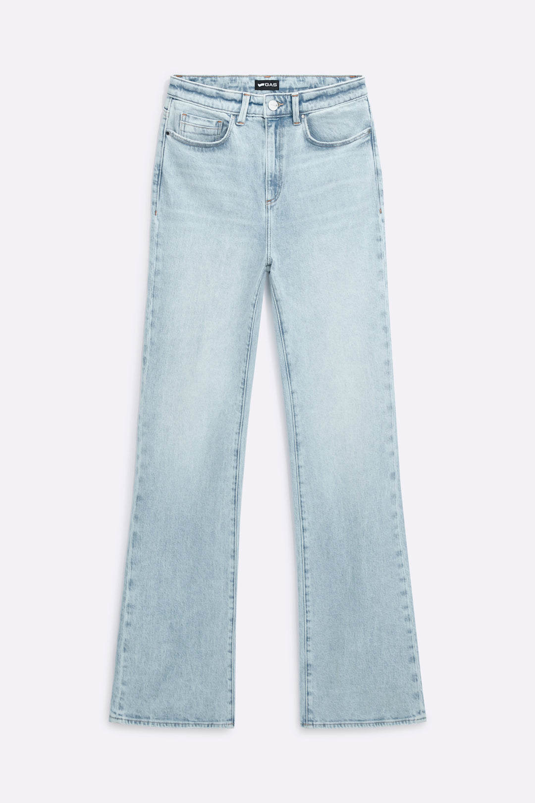 Women's 5-pocket flare fit denim, crafted from 9 oz fabric with enzymatic wash for an authentic and sophisticated look. The high-waisted design and flared leg from the knee add timeless elegance, perfect for completing chic and versatile outfits.