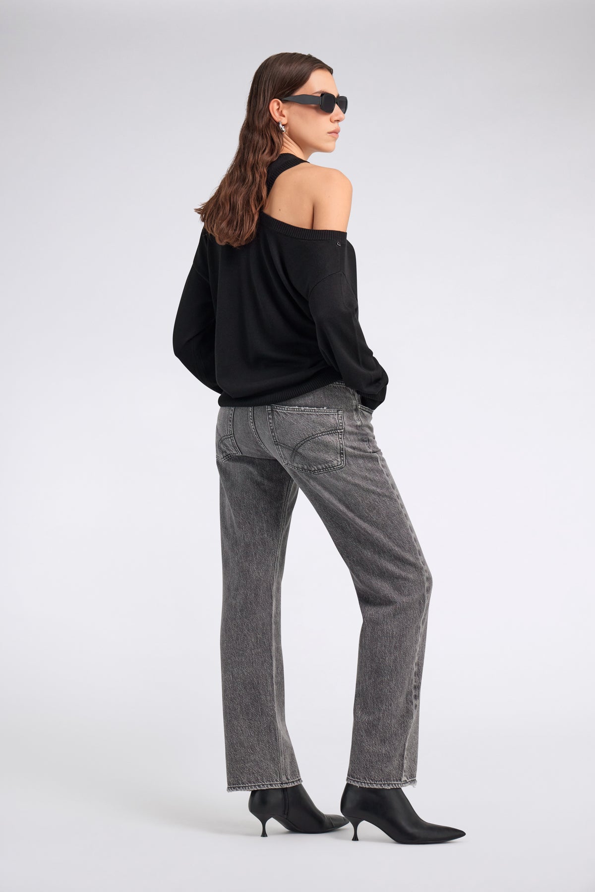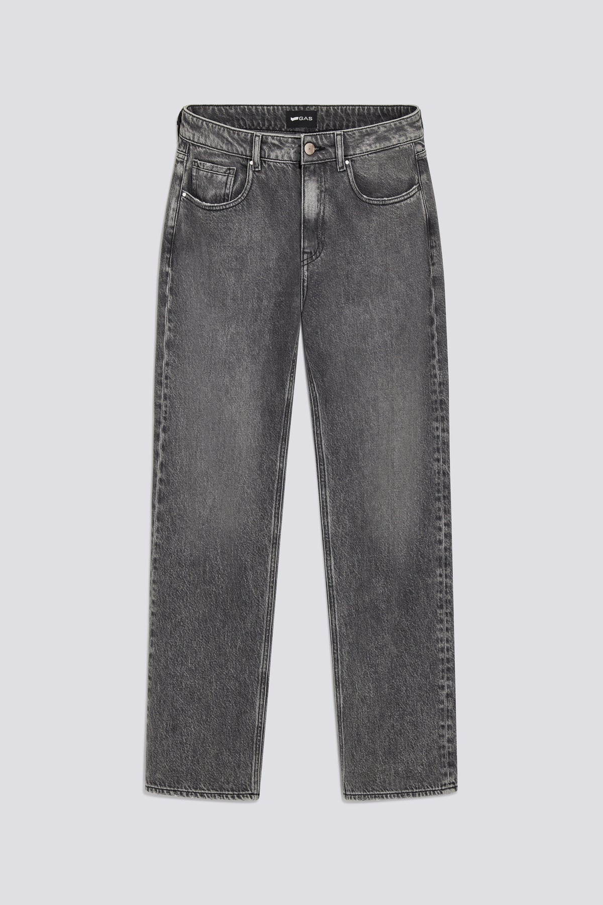 Women's 5-pocket straight fit denim in rigid black cotton-lyocell fabric, 10.75 OZ. The medium black marbled wash gives a sought-after and contemporary used effect. A revisited classic for bold looks, to pair with oversized blazers or soft knitwear for an effortless twist.