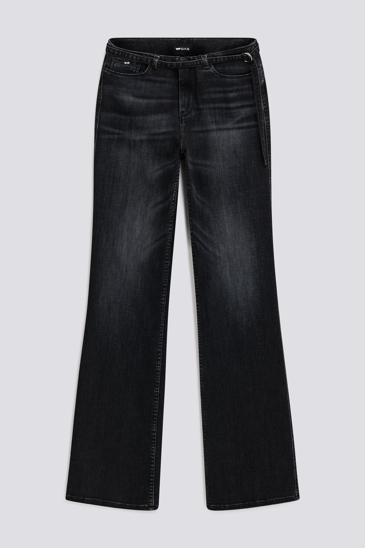 Low-rise women's bootcut jeans, made from 10.80 oz premium performance stretch denim for a flawless fit that enhances the silhouette. The medium dark wash offers a sophisticated and versatile look, perfect from day to night. Completing the design is a denim belt.