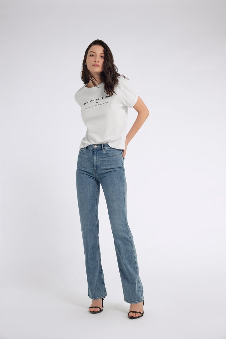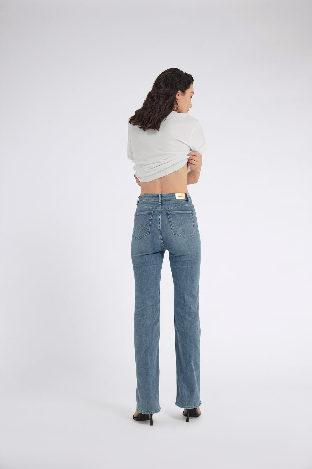 5-pocket denim in bootcut fit, crafted from lightweight Premium Perform Stretch fabric (9.40 OZ) and finished with a used basic wash in medium indigo blue. The bootcut design and classic 5-pocket style confer a timeless aesthetic, ideal for completing glam outfits.