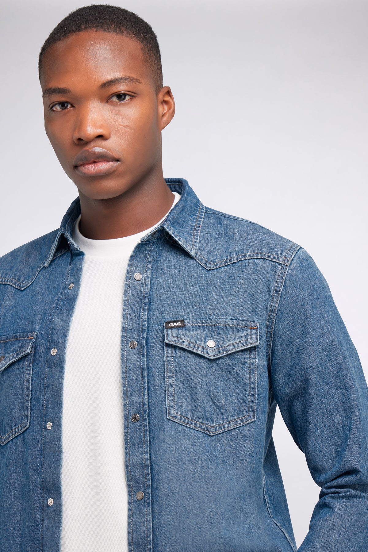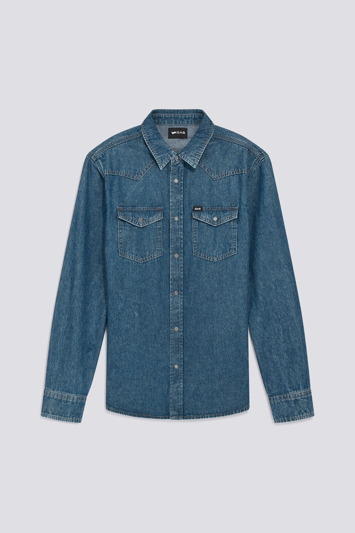 Men's shirt in fixed indigo blue denim 6.00 OZ with medium blue pumice stone wash. A classic of the male wardrobe, reinterpreted with a contemporary fit, perfect to pair with jeans for a total denim on denim eye-catching look.