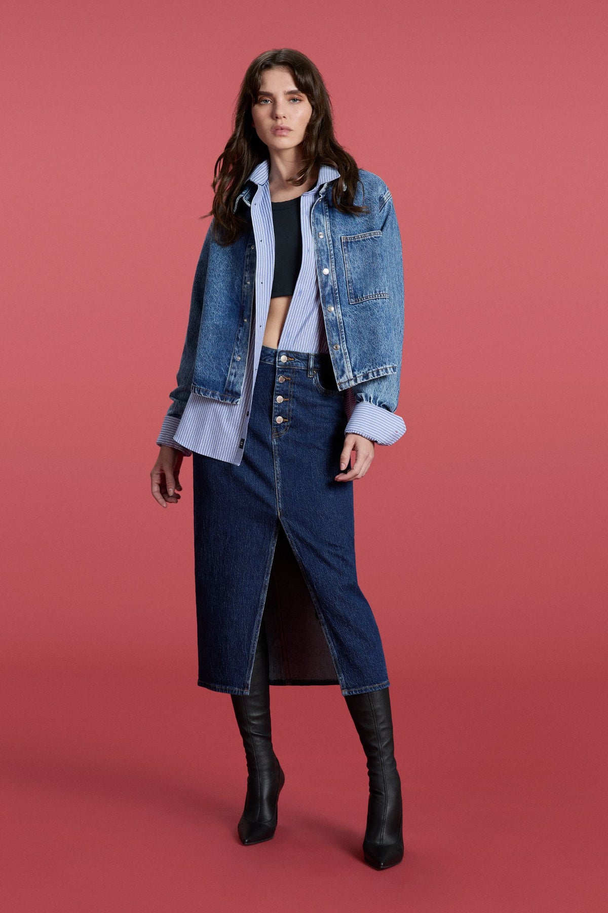 This midi denim skirt stands out for its medium dark pumice wash and 13.80 OZ comfort fabric with a strong material character. The front flap with exposed buttons adds a bold and timeless detail, perfect for enhancing the style even in the most minimal looks. A versatile and refined choice for those seeking contemporary yet authentic denim.