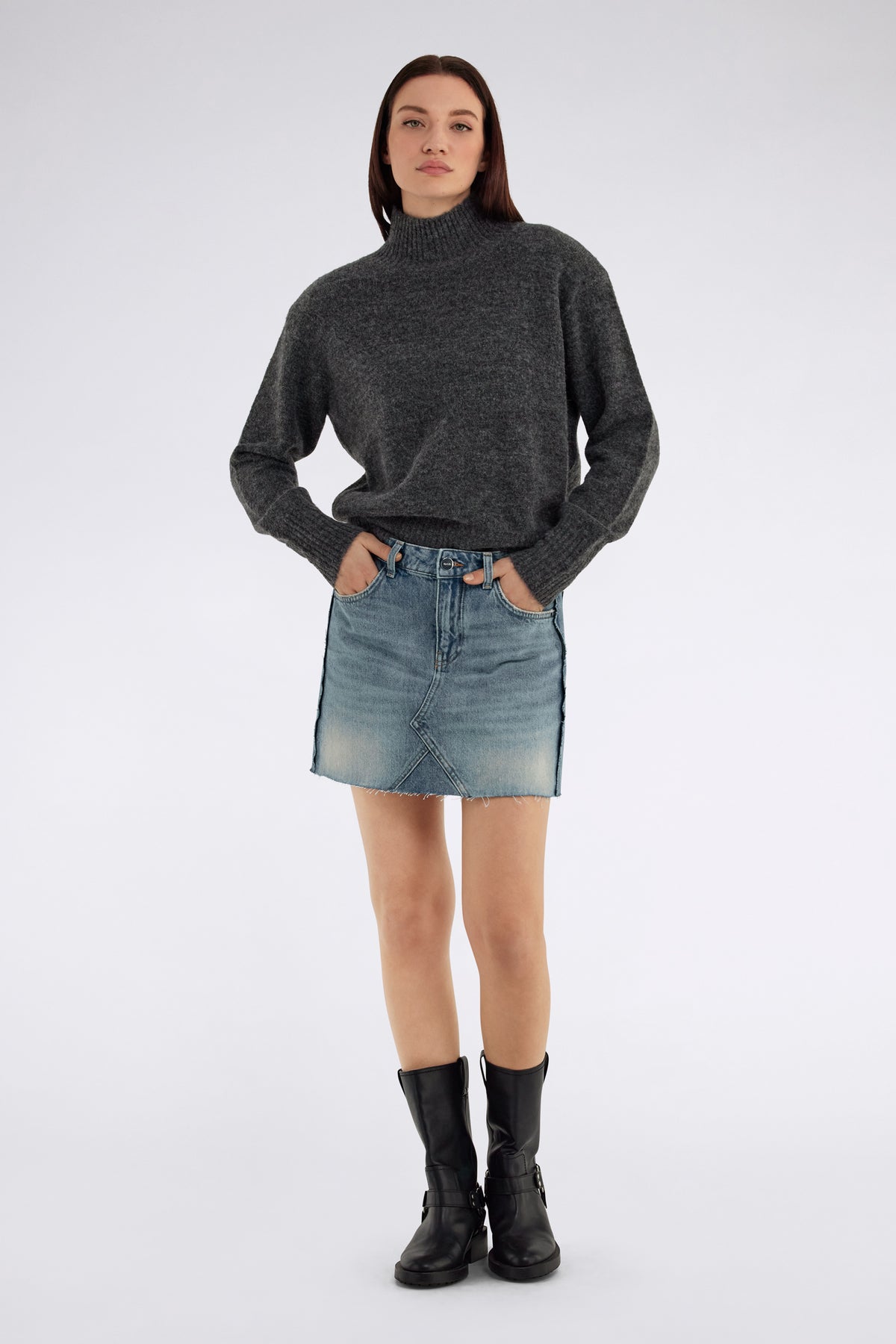 This regular fit denim skirt is made of fixed blue indigo fabric, weighing 12.50 OZ, with a medium-light pumice wash that provides an authentic and lived-in effect. The light abrasions on pockets and hem enhance its character, while the raw cuts on the sides add a bold touch. Perfect for completing your looks with an easy yet refined attitude.