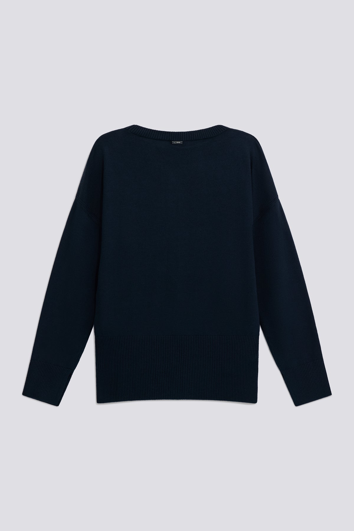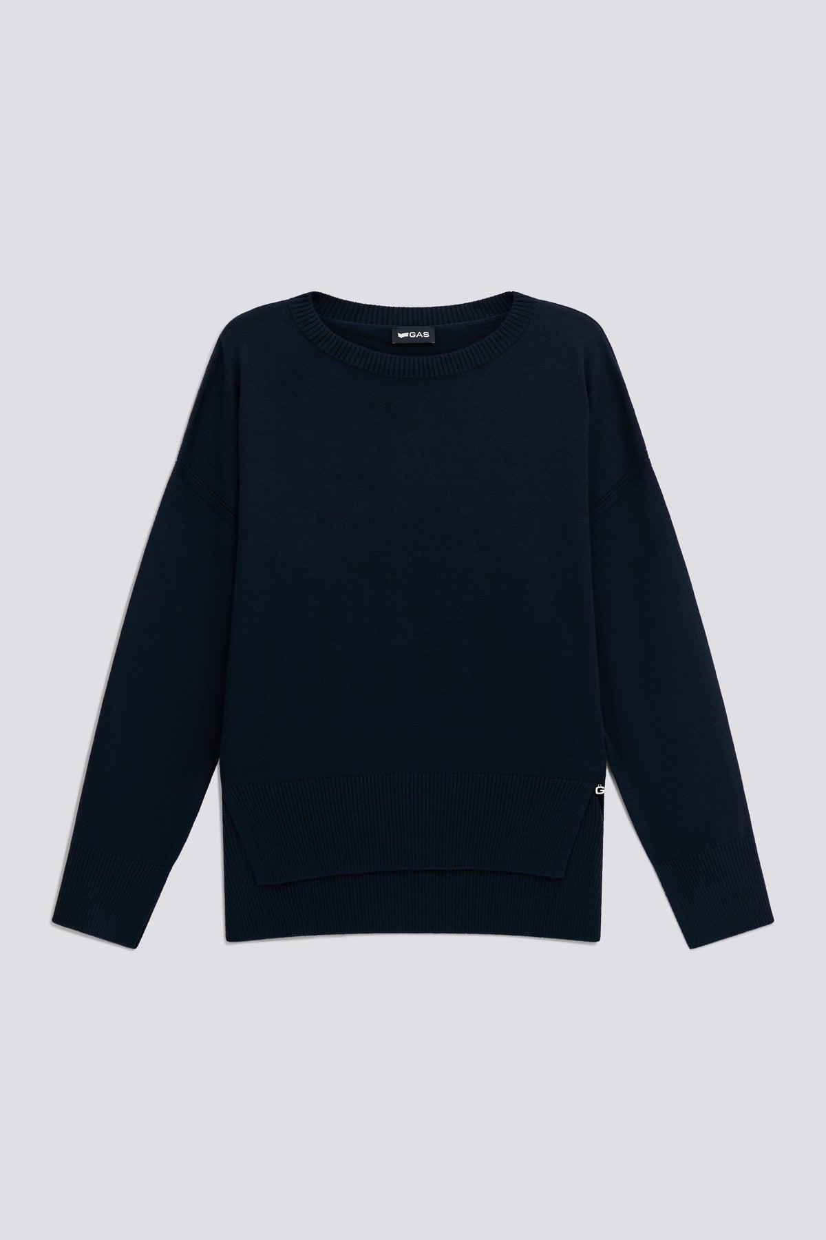Women's crewneck top, regular fit, made from 12-gauge viscose, featuring dropped shoulders and slits. An essential piece for everyday wear, perfect for those seeking comfort and originality. The light and refined design offers a flattering fit that enhances the silhouette, while the slit details add movement and a contemporary touch.