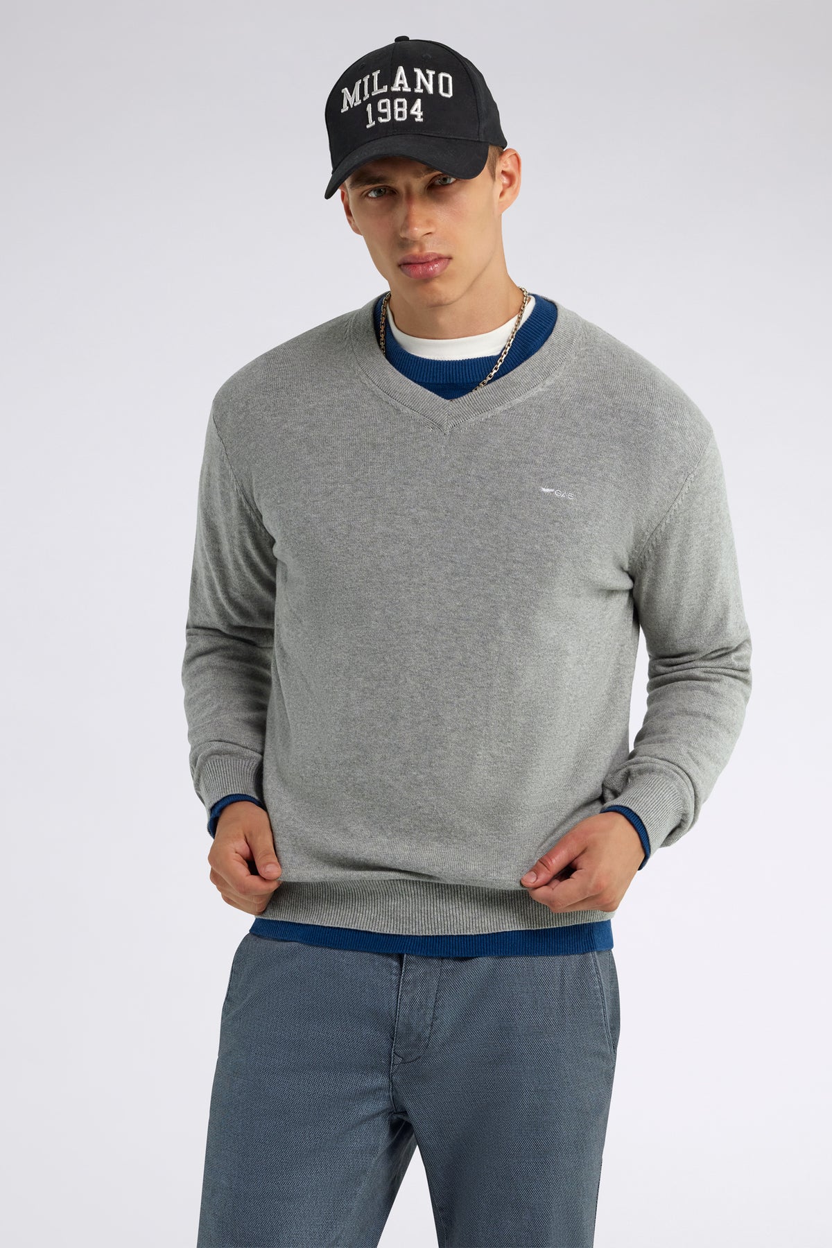 Men's slim fit V-neck sweater in soft cotton blend cashmere, embellished with GAS embroidery on the left chest. A refined winter essential, perfect on its own or under a jacket.