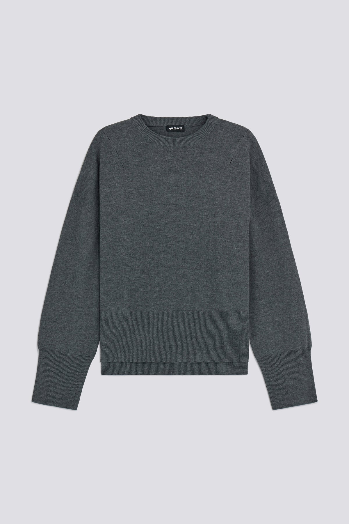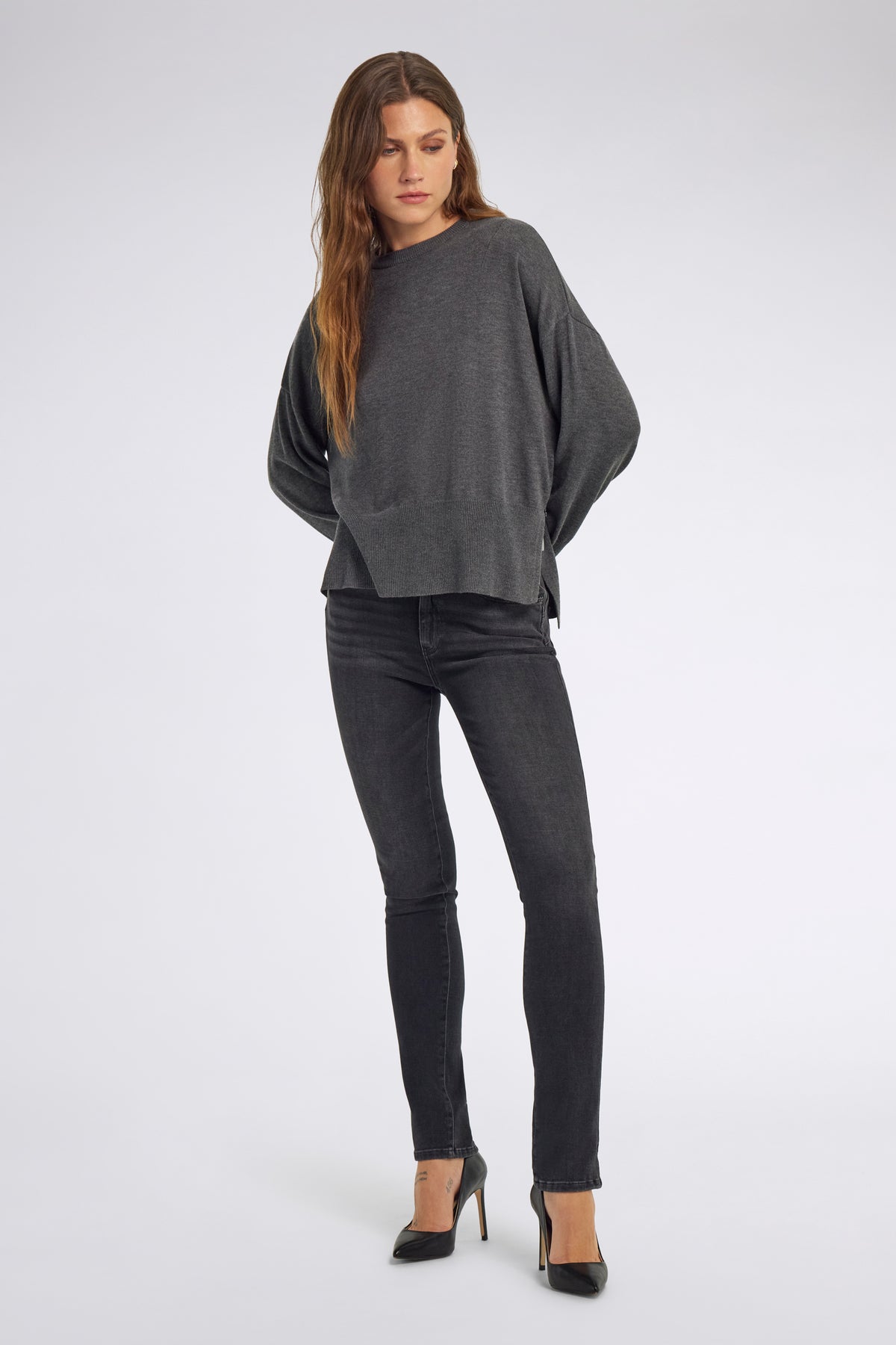Regular fit crew neck sweater in viscose and cashmere blend, enhanced by elegant shaping details on the front and side slits. A refined essential to pair with dark denim or midi skirts for an easy-chic everyday look.