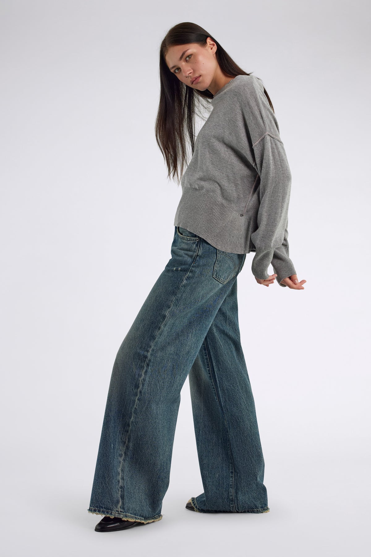 Women's crew neck sweater in fine gauge 12 cashmere blend, featuring dropped shoulders and side slits. Completing the design are contrasting seams on the armhole, slit, and hem for a sophisticated yet relaxed look. Finished with a logo plaque on the back and a 'G' metal charm on the side. A refined knitwear piece, perfect for everyday wear with ease.