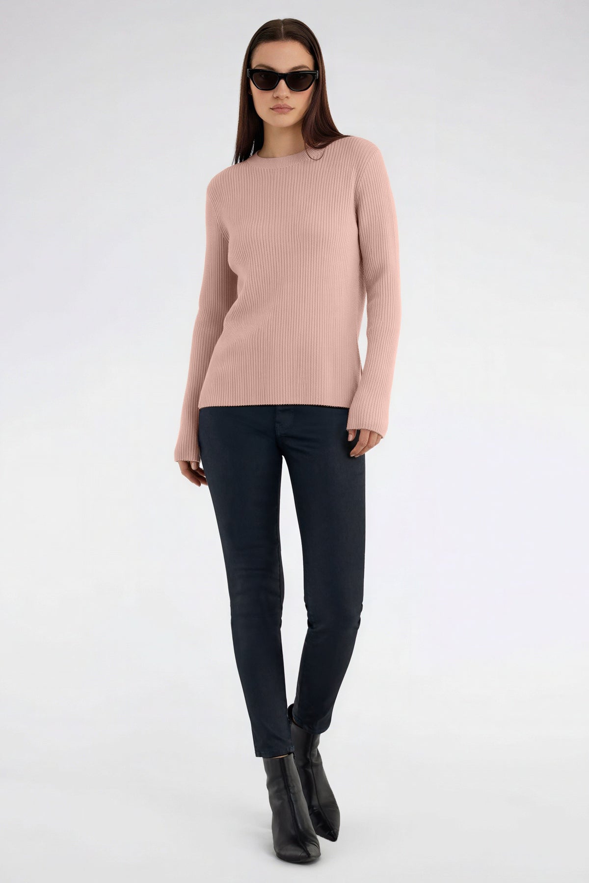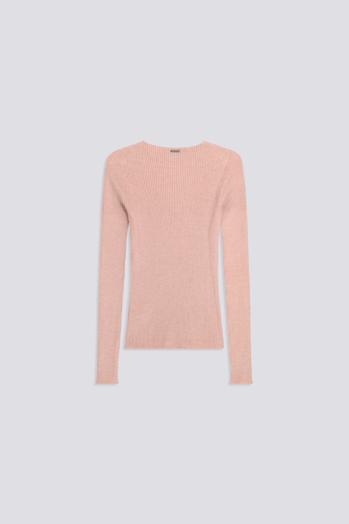 Slim fit ribbed crew neck sweater, crafted with seamless technology for comfort without seams and a perfectly defined silhouette. The fine viscose blend yarn of gauge 14 makes it soft and lightweight, perfect on its own or under a blazer. Iconic details like the metal plaque on the back and the 'G' pendant on the side add a distinctive touch. Essential and versatile: pair with midi skirts or high-waisted denim for a cool and feminine look.