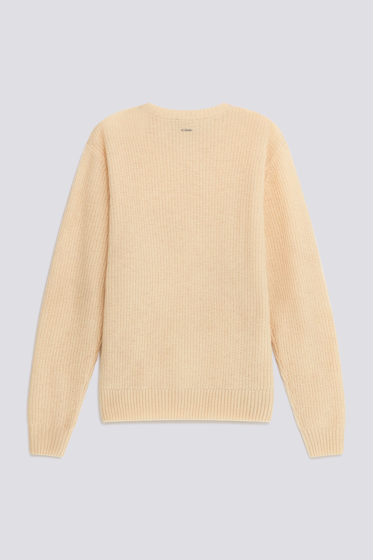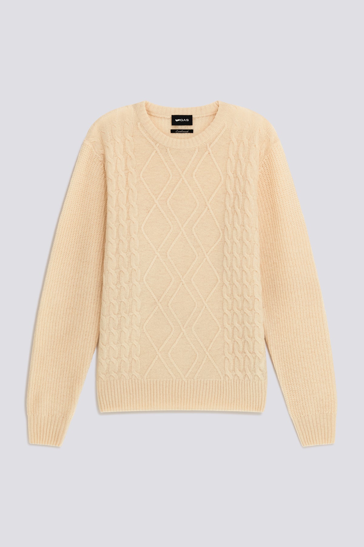Men's crew neck sweater with a regular fit in warm lambswool yarn, gauge 5, featuring a classic cable knit pattern. Finished with a metal logo plaque on the back of the neck, it is the perfect garment to face winter with style.