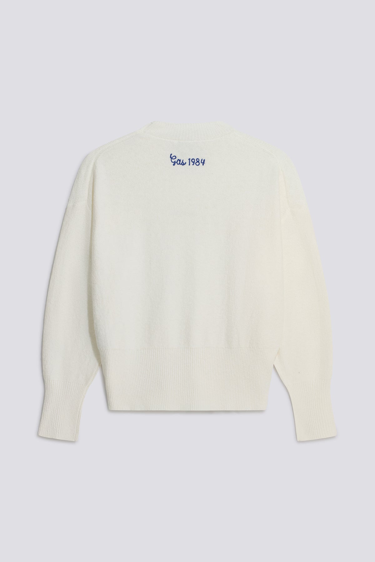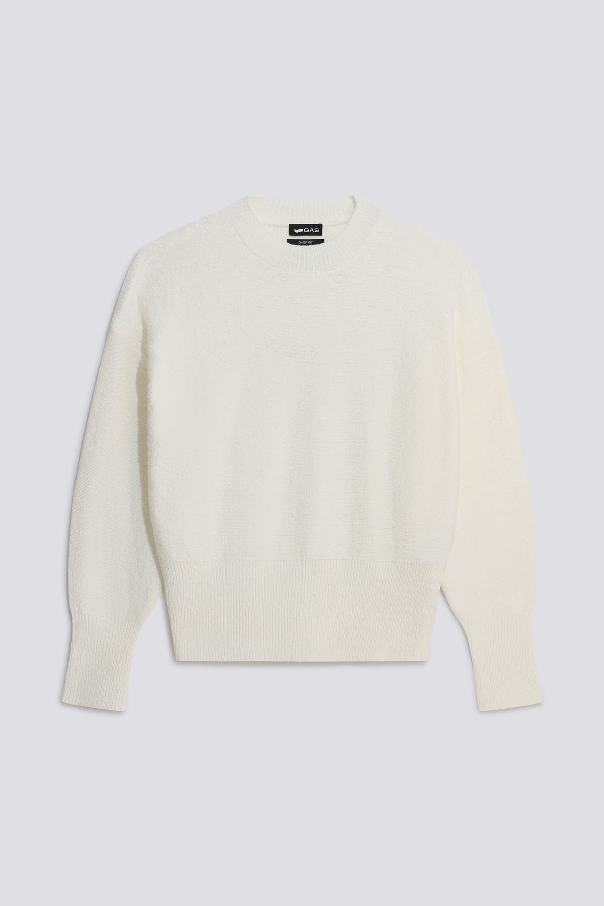 Oversized crewneck in reverse-stitched bouclé cotton blend, featuring a raised pattern on the sides that adds movement and character to the look. A cozy yet sophisticated piece, perfect to pair with wide-leg pants or a midi skirt for a cool and contemporary play of volumes.