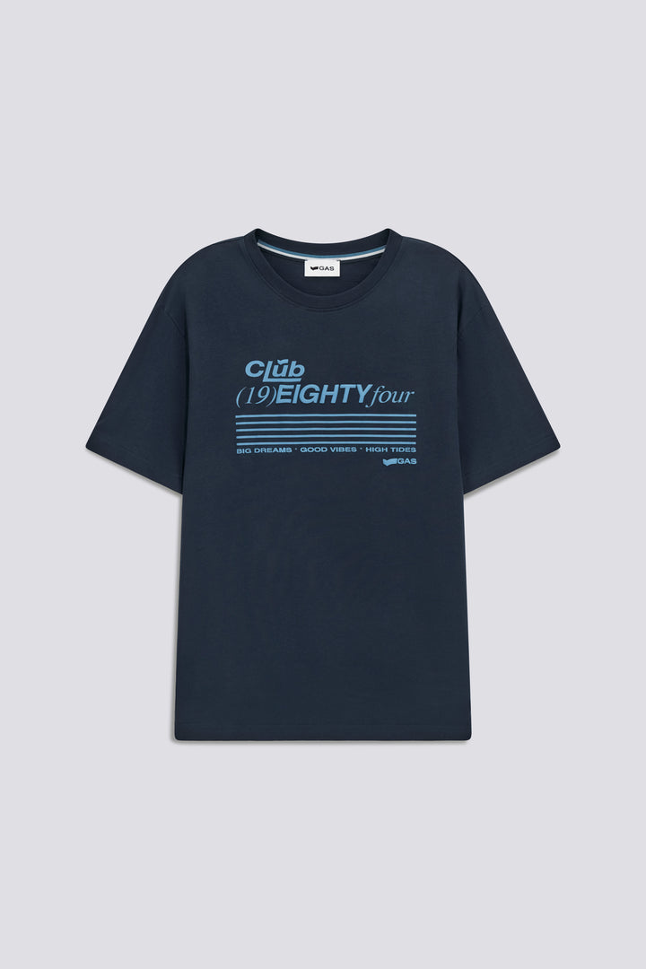 Short-sleeved T-shirt with a regular fit, made from soft cotton jersey. The design stands out for the combination of puff print and water-based print in contrasting colors on the chest, adding a three-dimensional effect and a graphic touch. Perfect for completing casual looks with a street twist.
