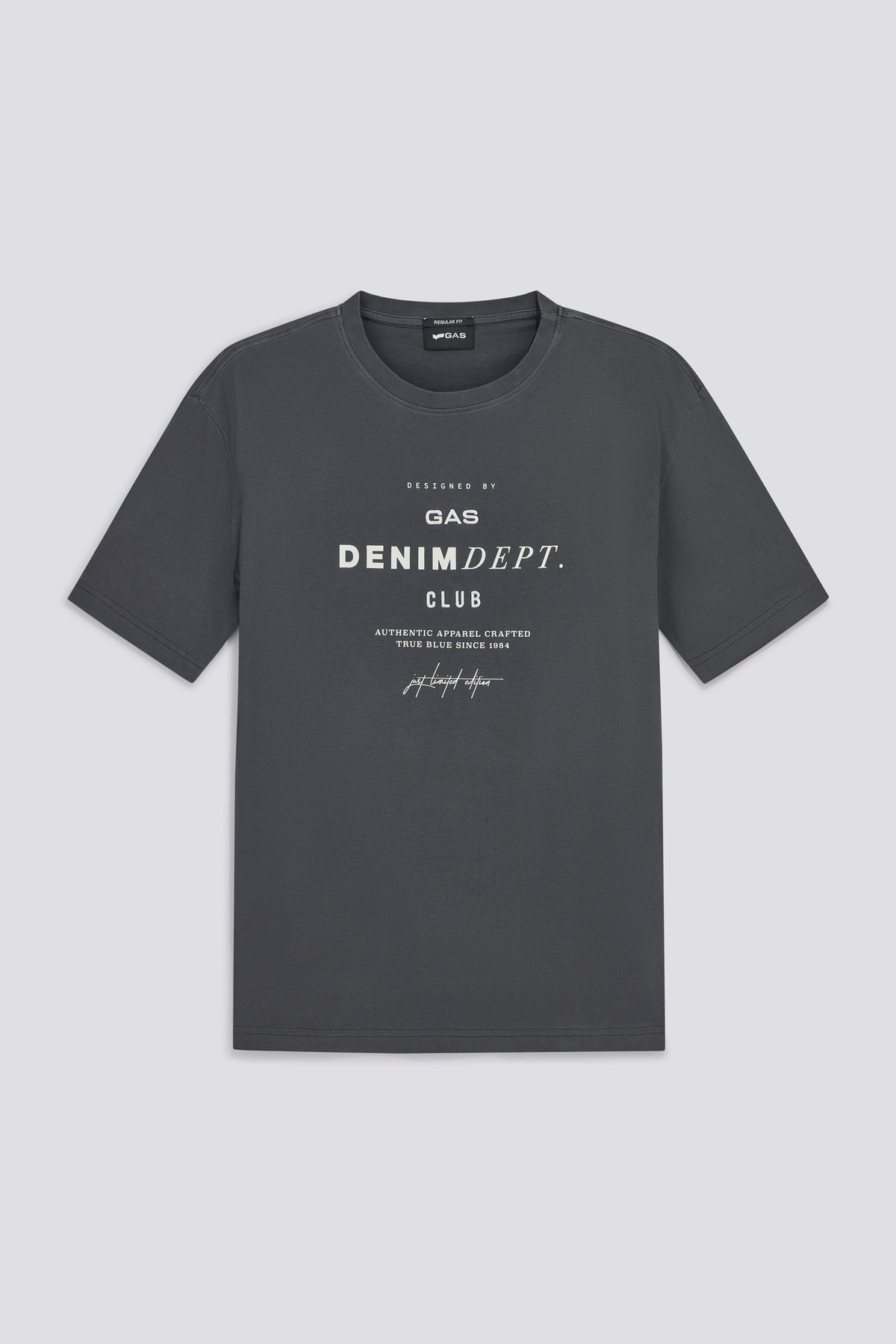 Short-sleeved regular fit T-shirt in cotton jersey, garment-dyed and acid-washed for a unique lived-in effect. Water-based print and embroidery on the front add an urban twist to the look.