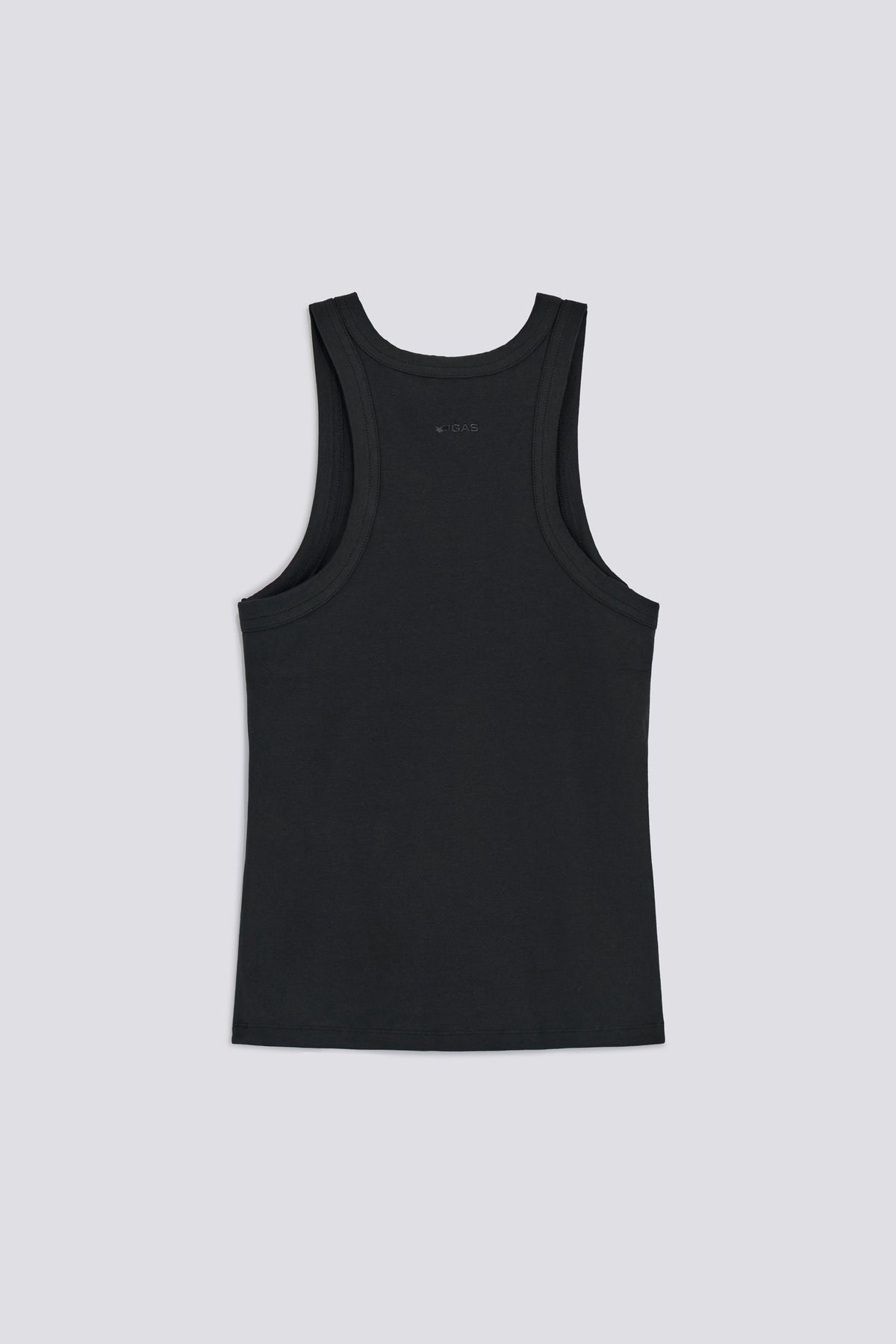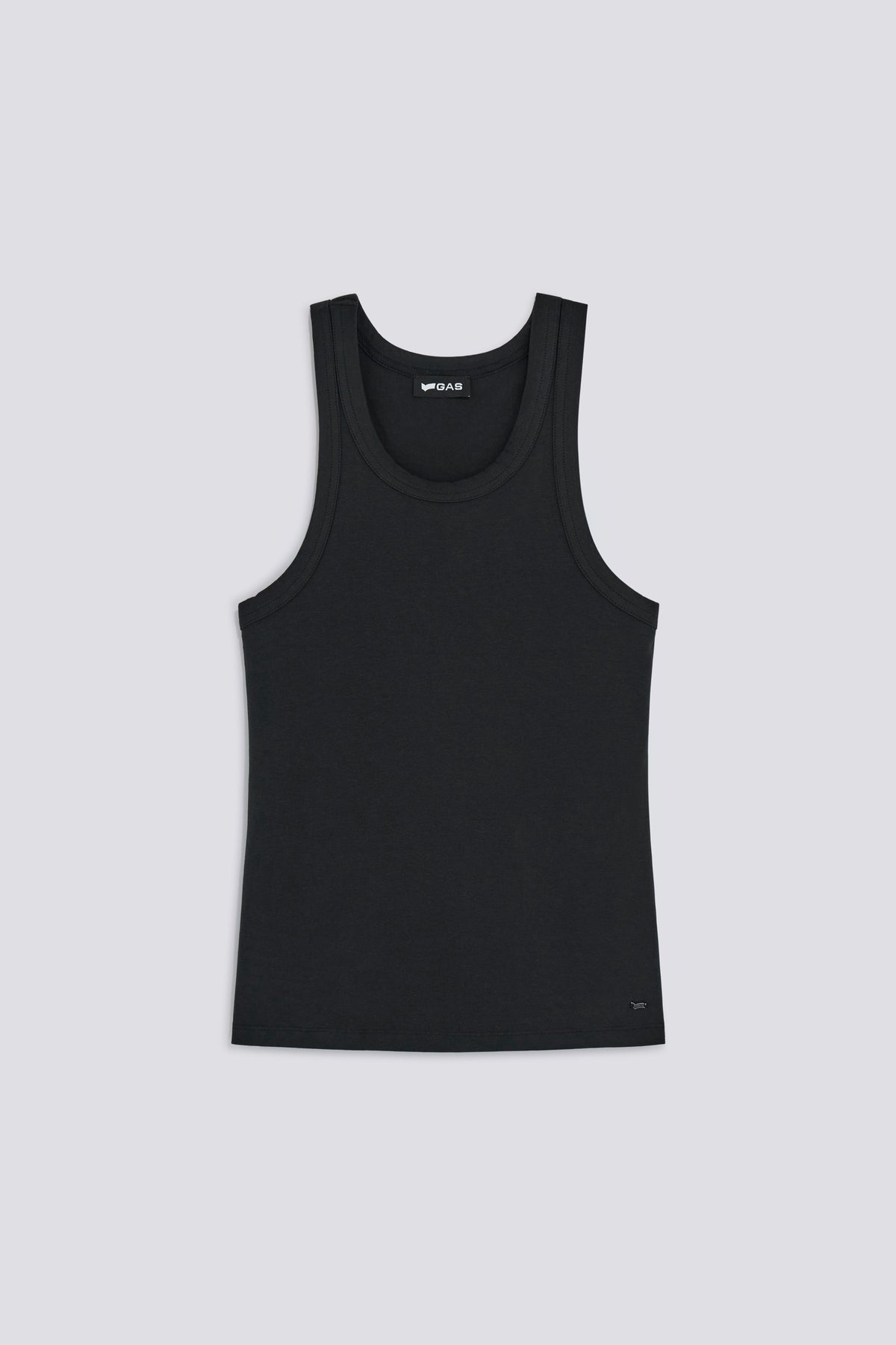 Slim fit tank top in stretch cotton jersey, enhanced by a glossy tone-on-tone print on the back and logo plaque applied at the front hem. A contemporary twist essential perfect as a base for your looks.