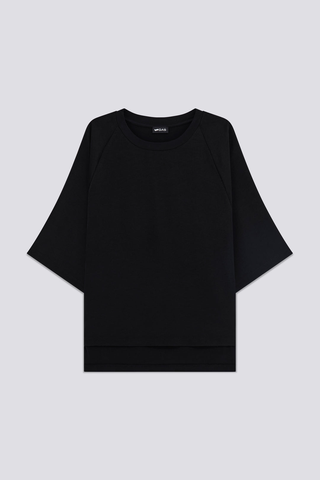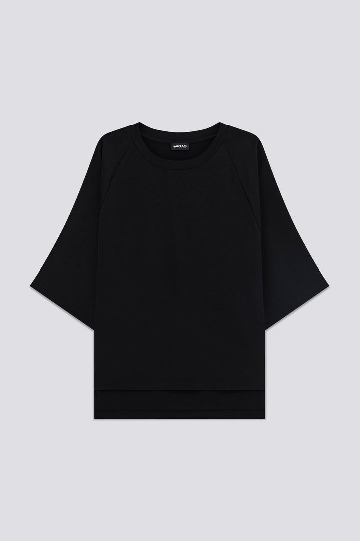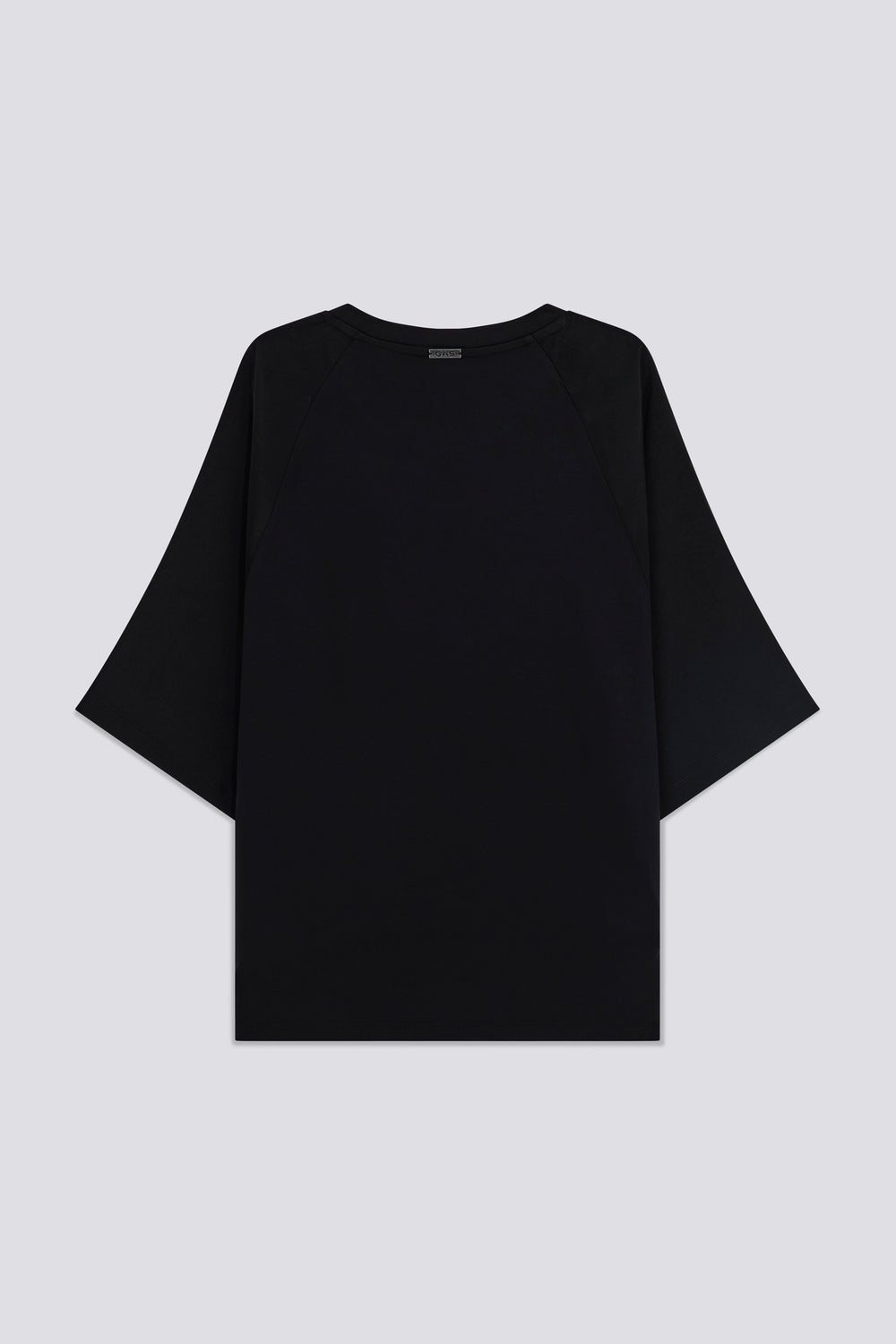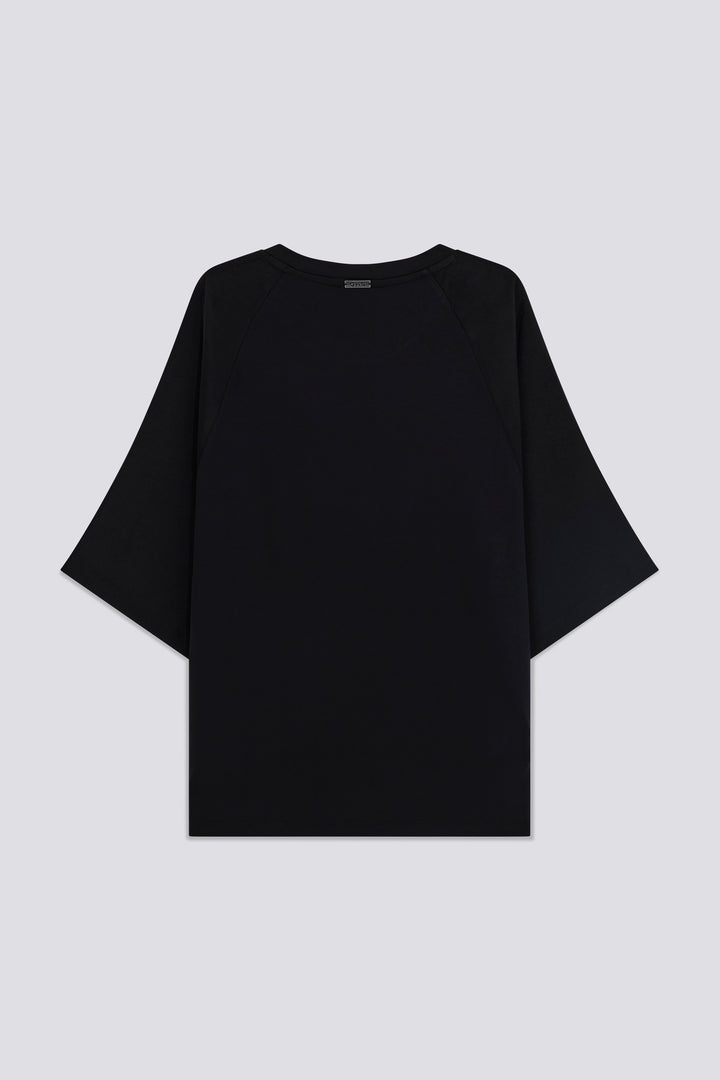 Women's short-sleeve t-shirt, relaxed fit, made from a combination of fresh satin on the front and sleeves, and soft viscose jersey insert on the back and collar. An elegant and comfortable piece, personalized with a branded metal plaque on the back neckline. Perfect for a sophisticated yet relaxed look, combining refinement and comfort in one piece.
