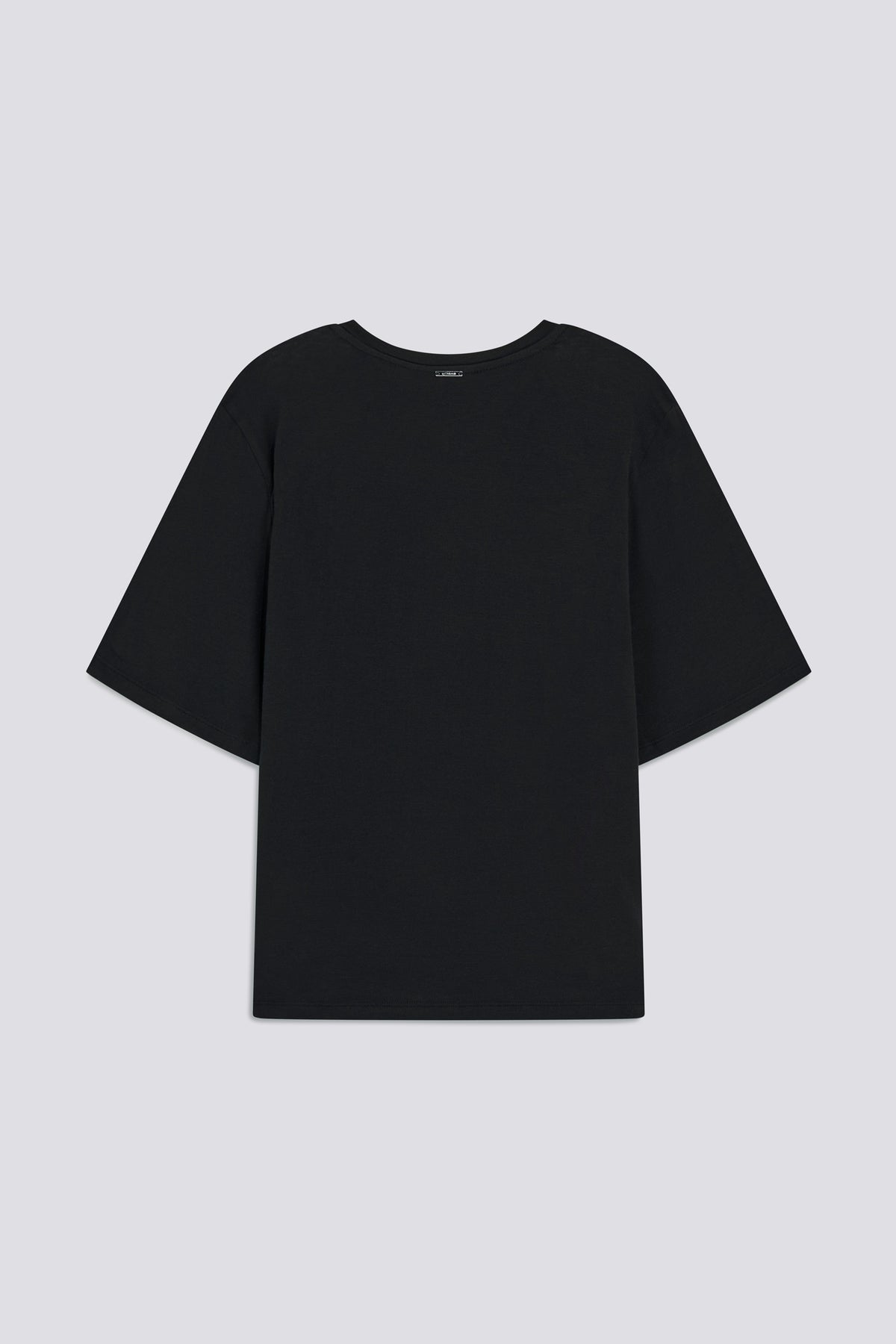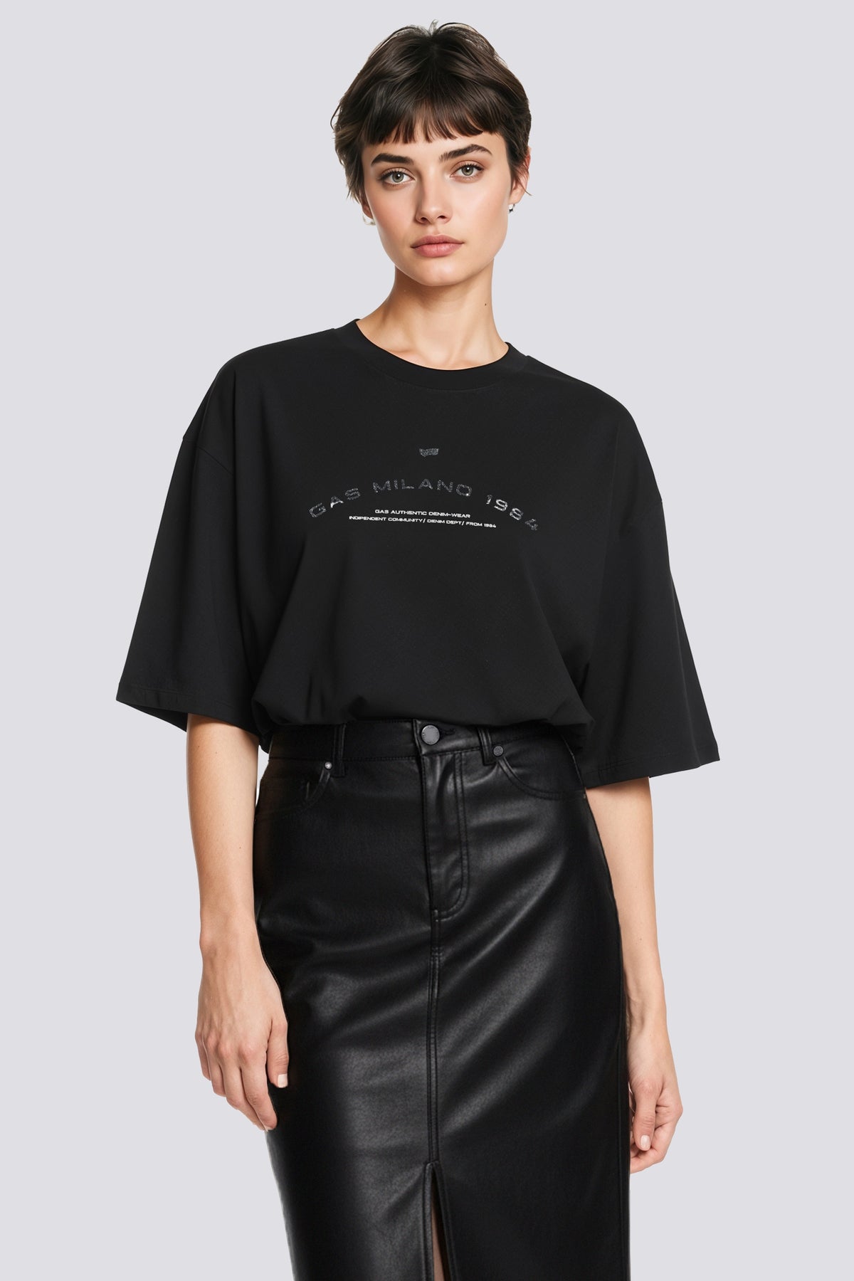 Short-sleeve women's t-shirt in jersey with a warm feel, regular fit. The graphic print on the front adds character, while the metallic details – the logo plate on the back and the letter 'G' applied to the side slit – add a bold and distinctive touch. An essential with attitude.