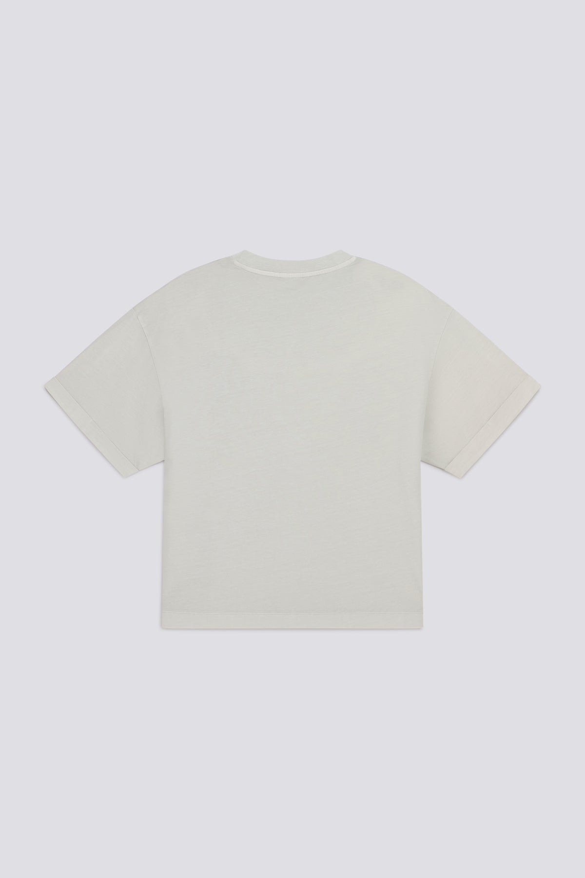 Women's short-sleeve t-shirt with a comfort fit and fixed roll-up hem. Made of pure cotton jersey, it stands out for its water-based print and flock details on the front, highlighted by a pigment dye that gives it a unique and lived-in look. Easy, bold, effortlessly cool.