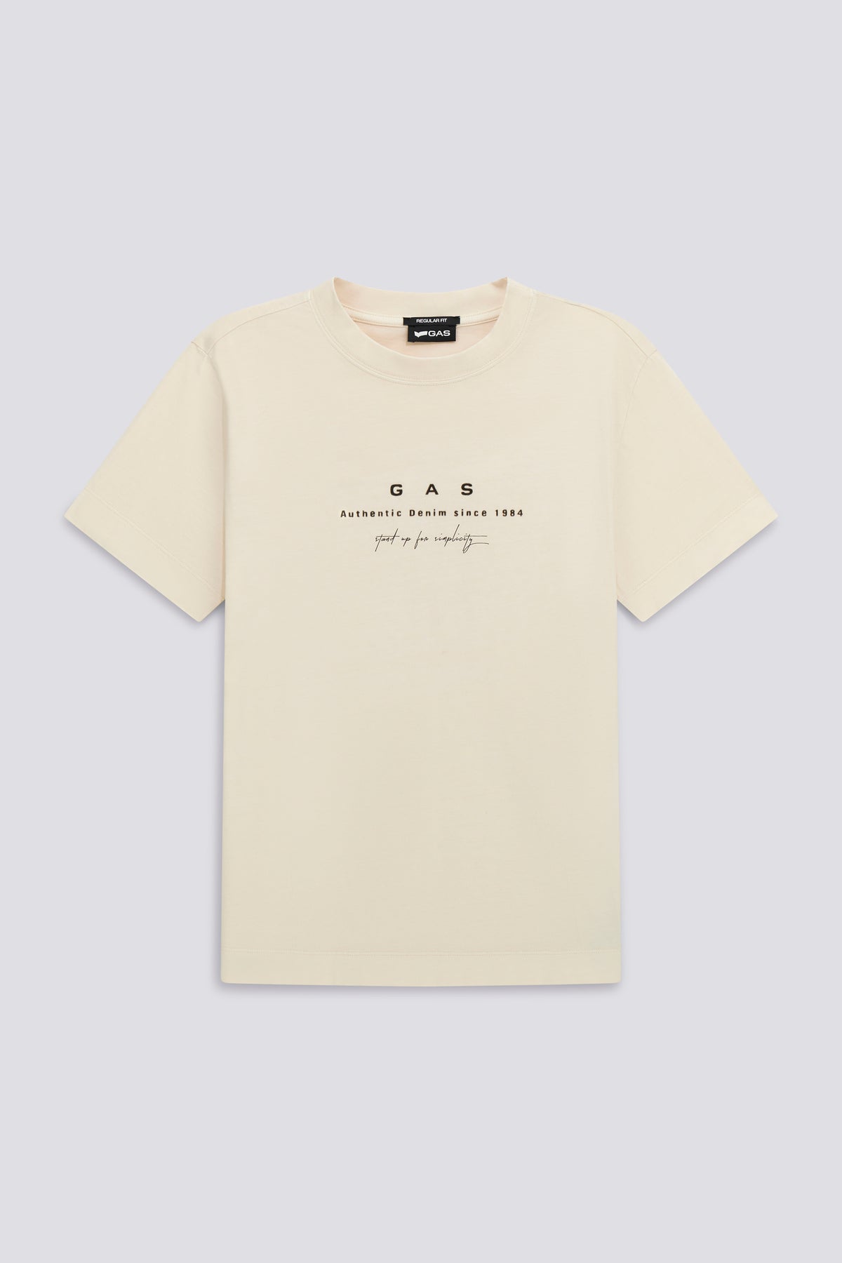 Regular fit crew neck t-shirt in 100% cotton jersey, with a lived-in and authentic look. The water-based print with flock details on the front combines with the garment-dyed antique effect for a bold aesthetic.