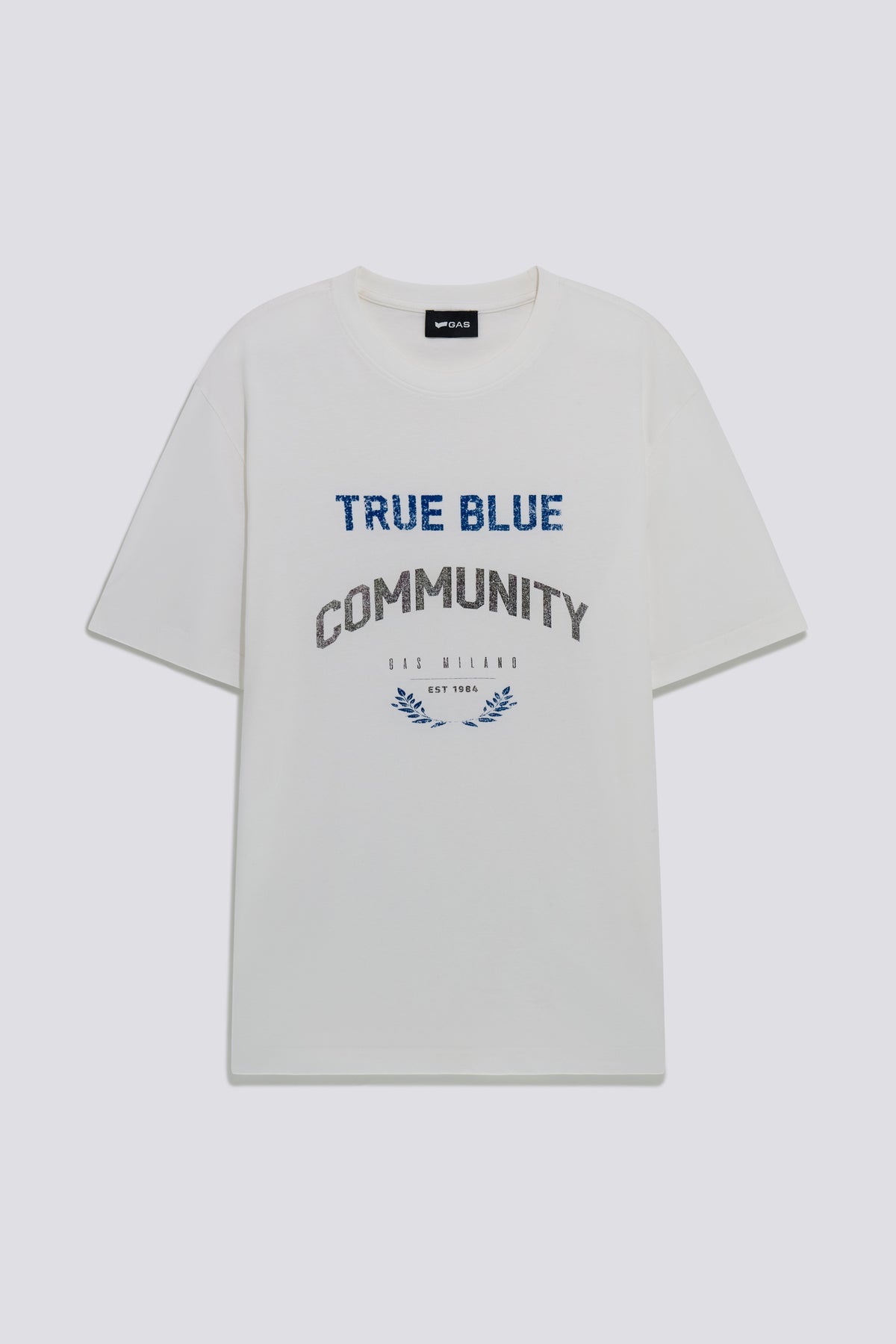 Men's short-sleeve T-shirt, regular fit, made of cotton jersey. The "True Blue" print on the front combines mixed techniques — flock and water-based print — for a textured and impactful effect.