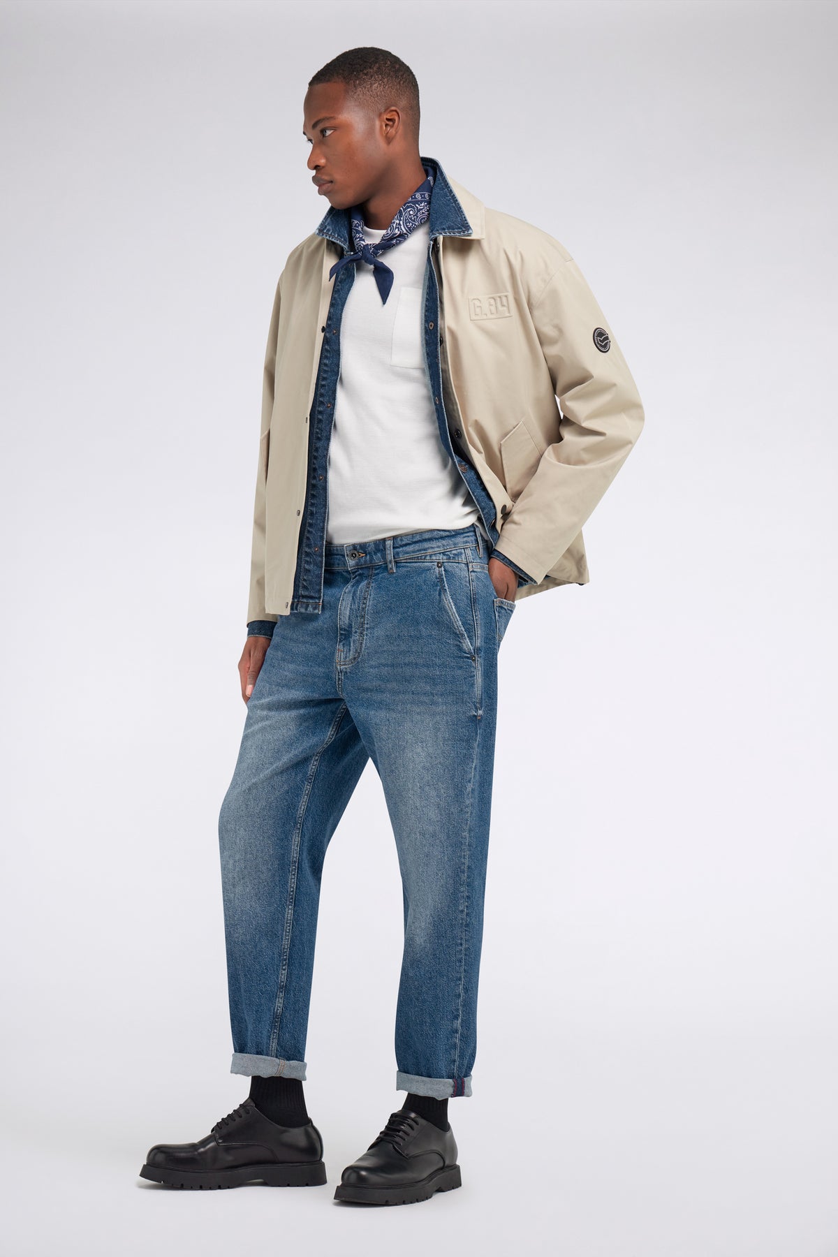 Men's denim chino with tapered fit, made from comfort fabric with authentic effect measuring 11.50 OZ. The medium dark wash with pumice gives the indigo blue a worn but sophisticated character. An essential choice for an effortless outfit with a contemporary twist.
