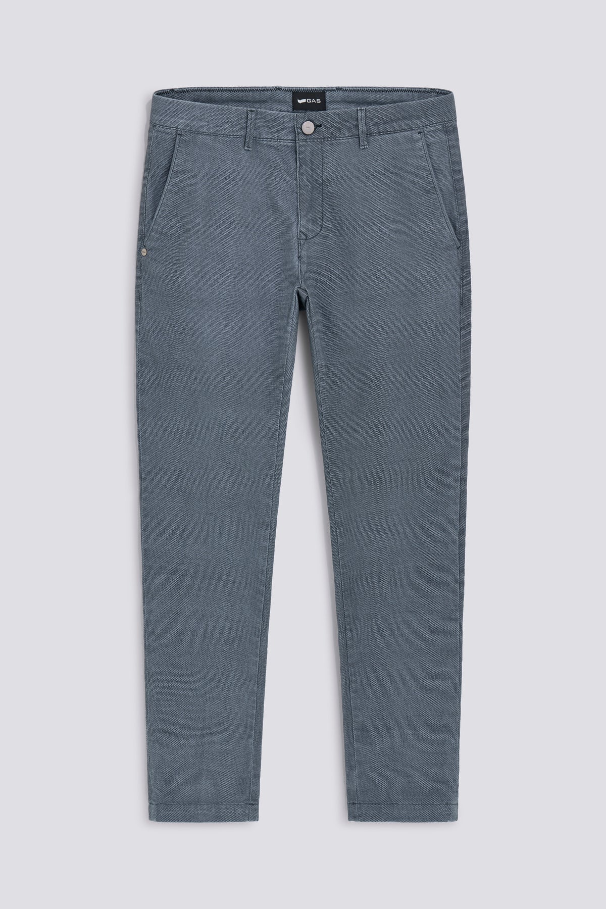 Men's chino-style pants, slim fit, made of stretch cotton gabardine with an all-over micro print. A classic style updated with a contemporary twist: the subtle pattern adds personality, while the slim fit and stretch fabric ensure comfort and versatility in every look.