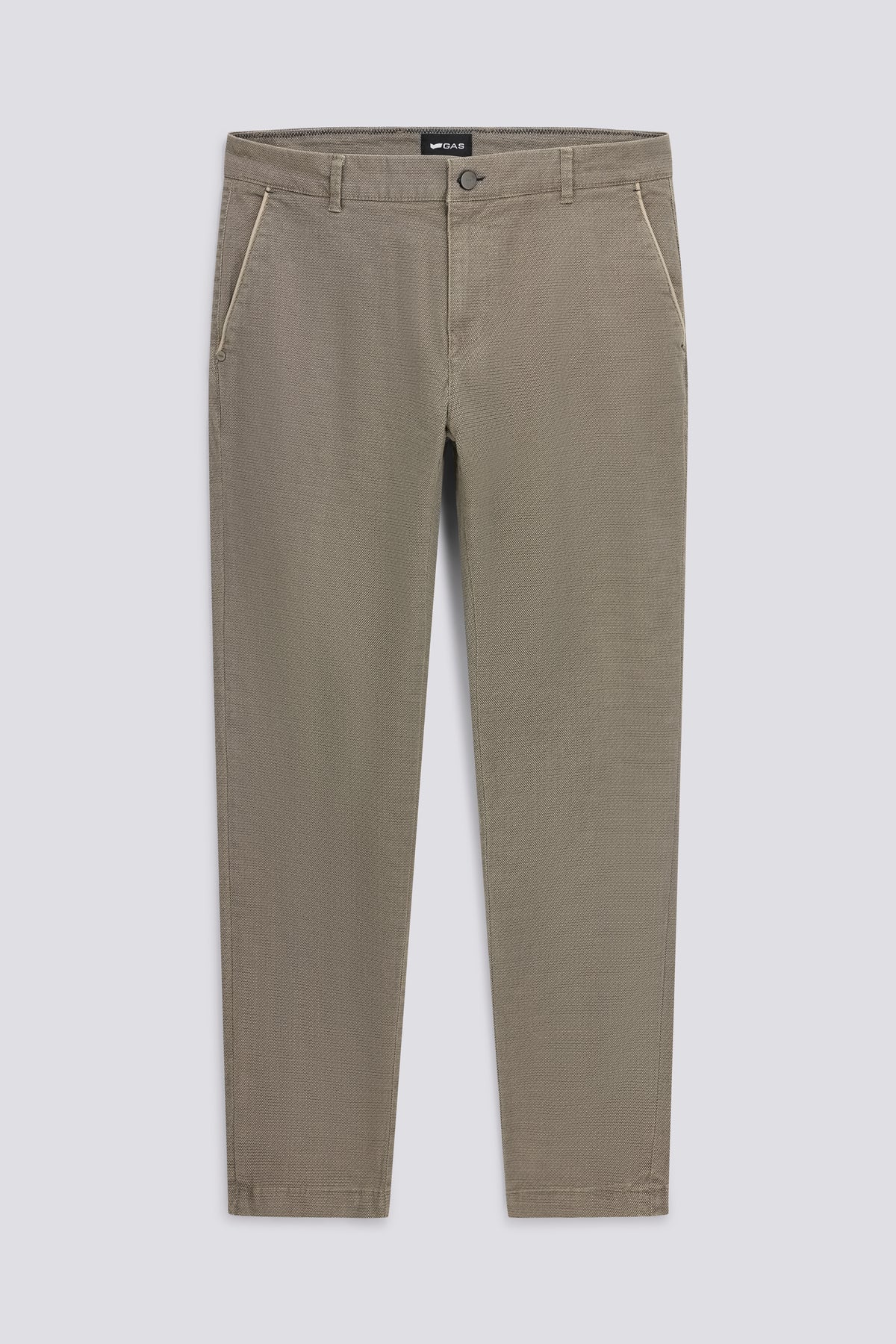 Men's trousers, chino cut, slim fit, in stretch cotton gabardine with micro all-over print. A classic revisited with a modern twist: the discreet pattern adds personality, while the slim fit and stretch fabric ensure comfort and versatility for any look.