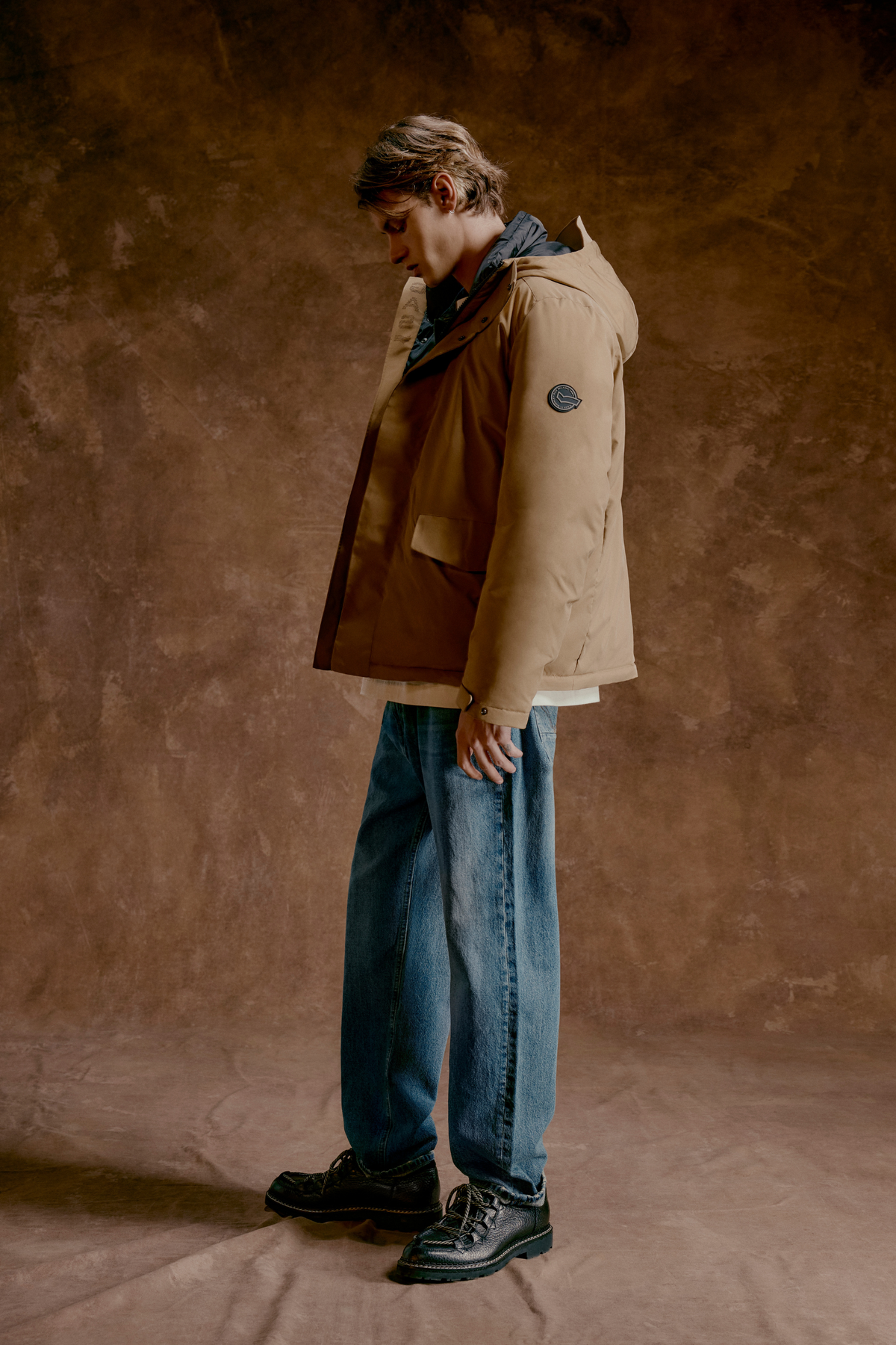 The padded men's jacket made with eco down combines performance and style. The water-repellent fabric makes it perfect for everyday use, the hood and side pockets ensure functionality, while the logo patch on the left sleeve signs the look with an iconic touch. An ideal piece for the city and leisure.