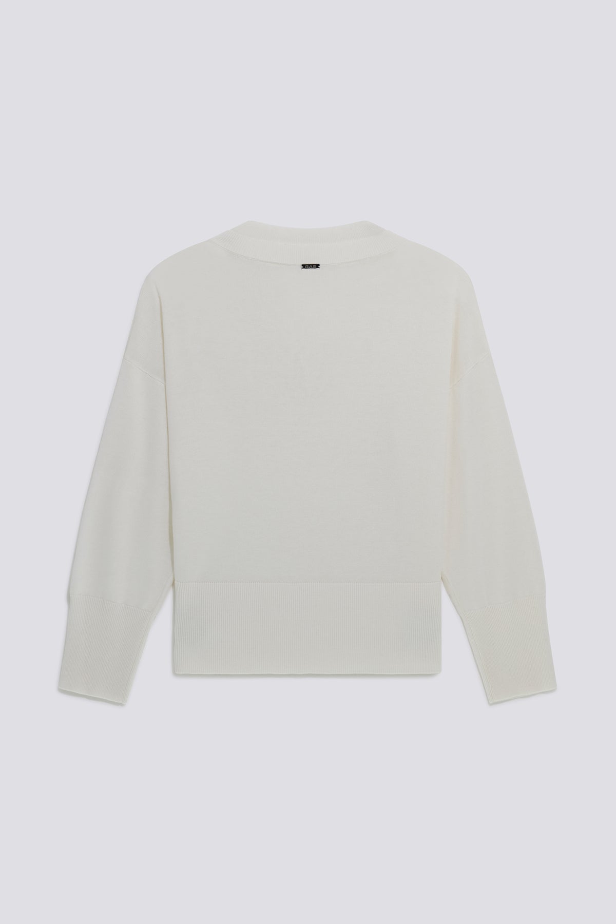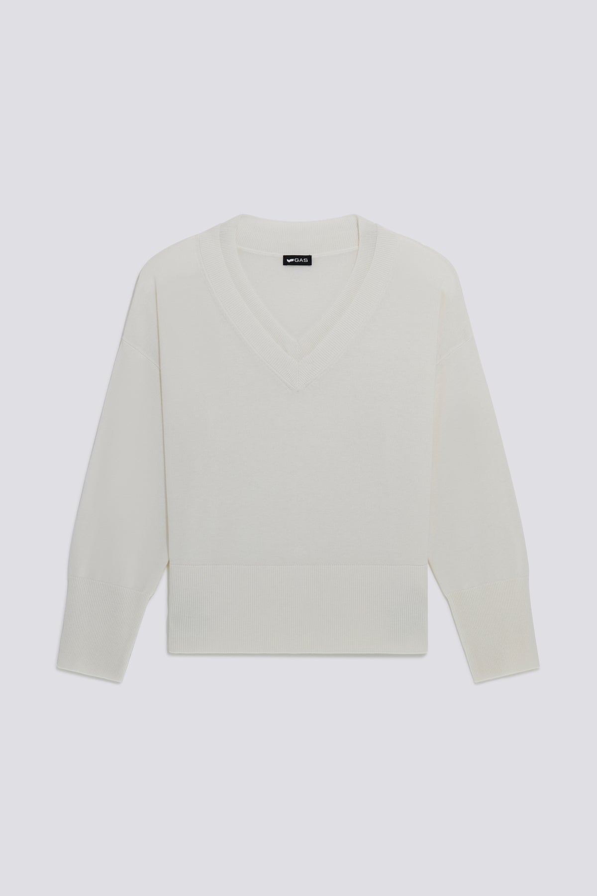 Women's sweater with V-neck, featuring a feminine and refined cut, made from fine 12-gauge cashmere blend viscose. The double neckline adds a touch of timeless elegance. Wear it with flare jeans for an effortless day look or with a denim pencil skirt for a more glam twist.