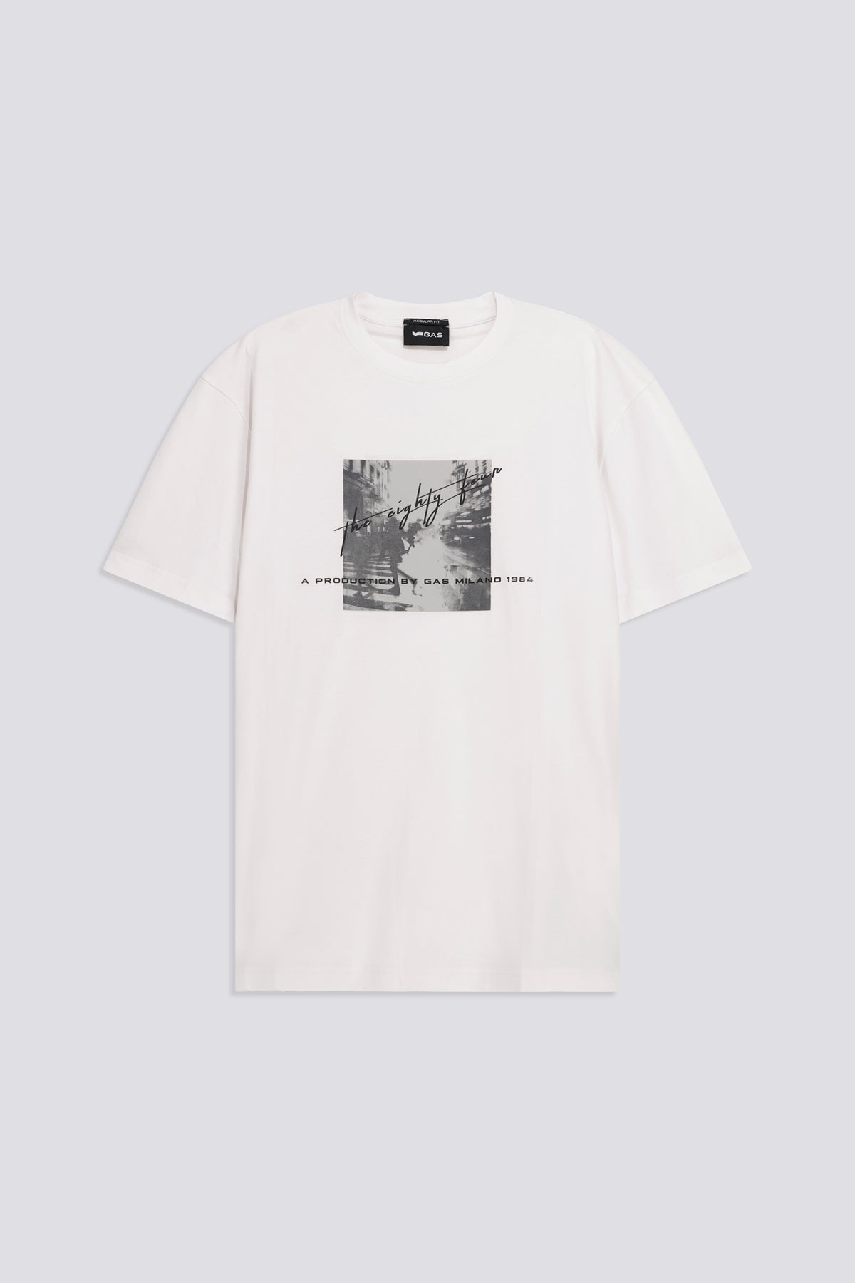 Short sleeve t-shirt, regular fit, in stretch cotton jersey. The photographic print with embossed writing in the center adds a bold graphic touch, perfect for elevating even the most essential looks.