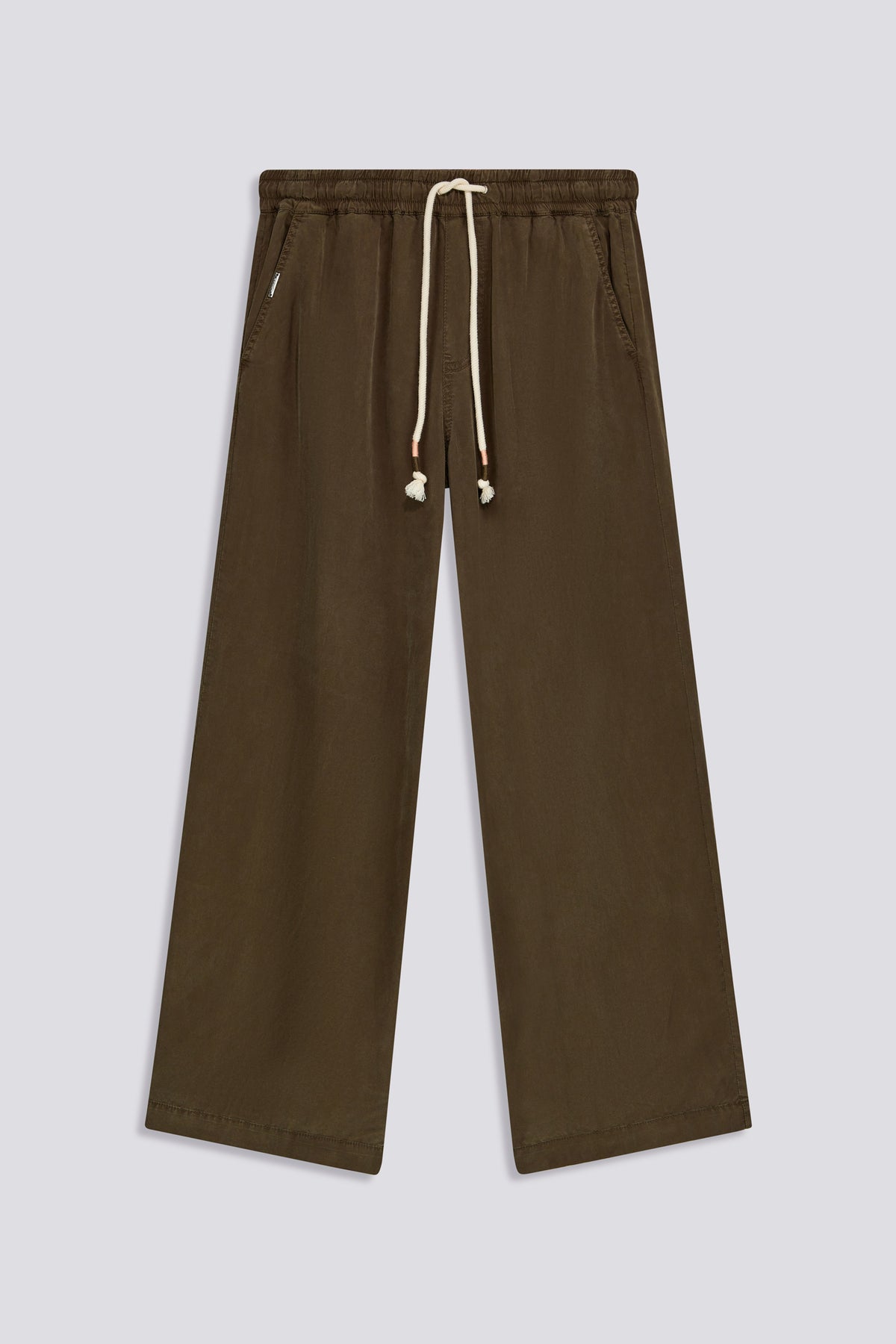 Women's relaxed fit pants with a wide leg, made from garment-dyed Tencel. The lightweight, fluid fabric offers comfort, while the elastic waistband with drawstring ensures an easy fit. Functional and distinctive details such as the all-over logo pocket lining, tassel tips, and metal logo plaque on the pocket complete the design. A versatile piece, essential for the summer wardrobe, to pair with tops, shirts, and lightweight knits.