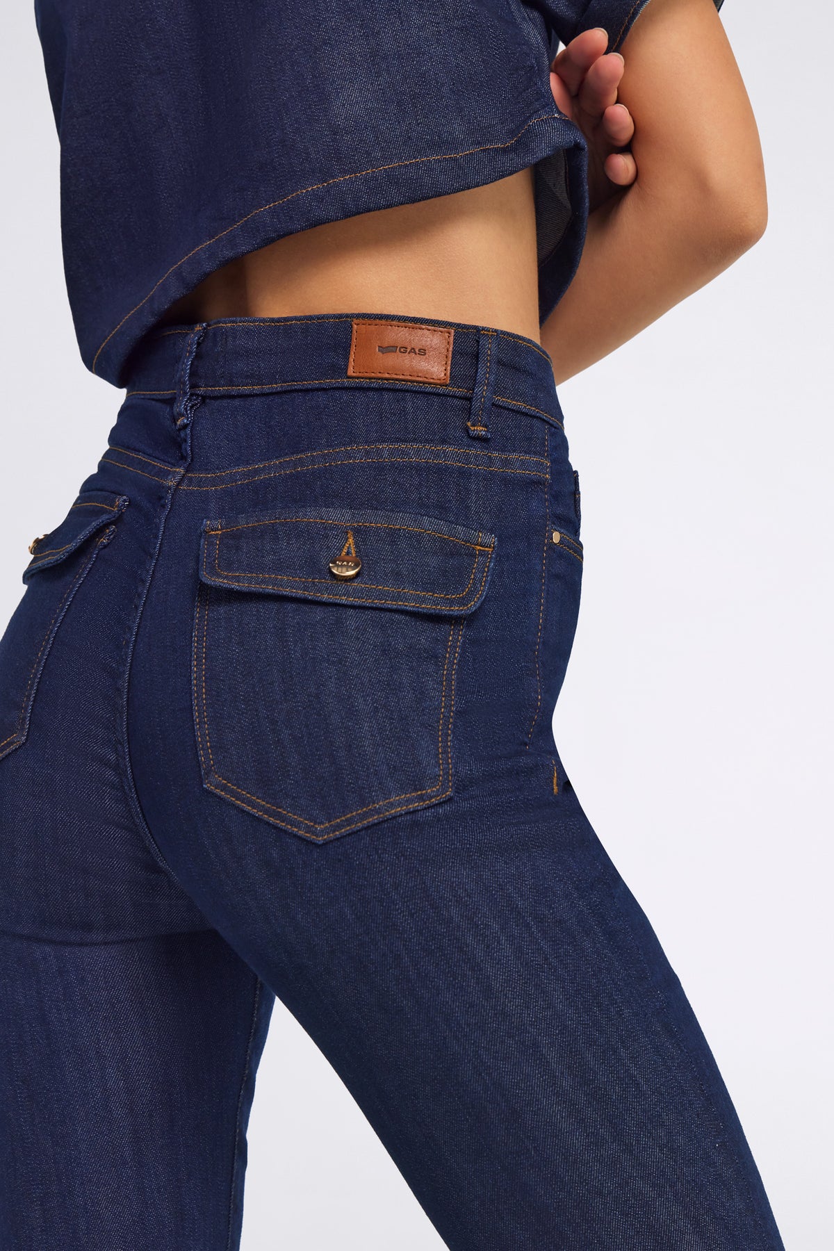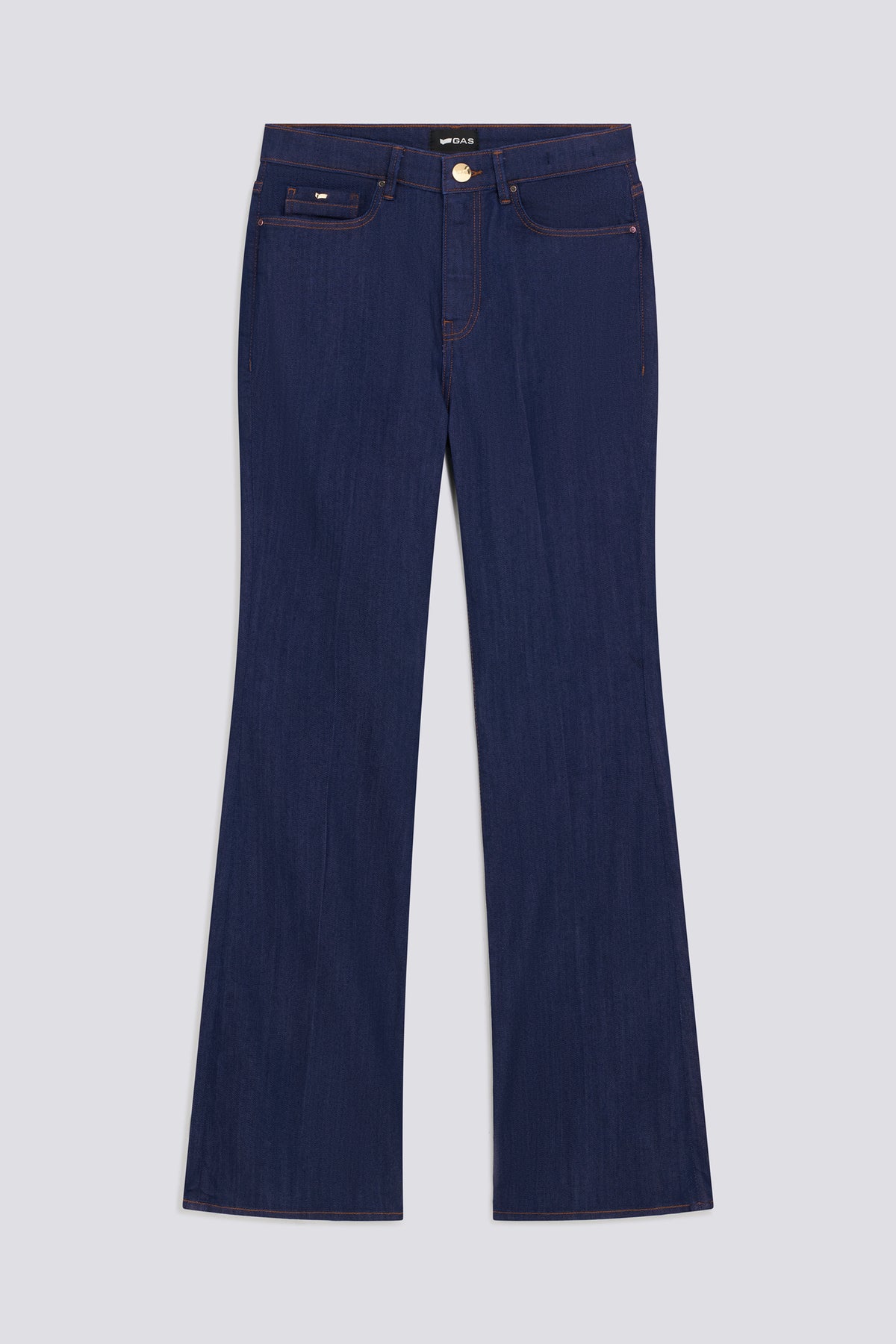Women's 5-pocket flare fit jeans in indigo cotton-lyocell fabric, 9.50 oz. Featuring a rinse wash, they are ideal for sophisticated, contemporary outfits where denim takes center stage.