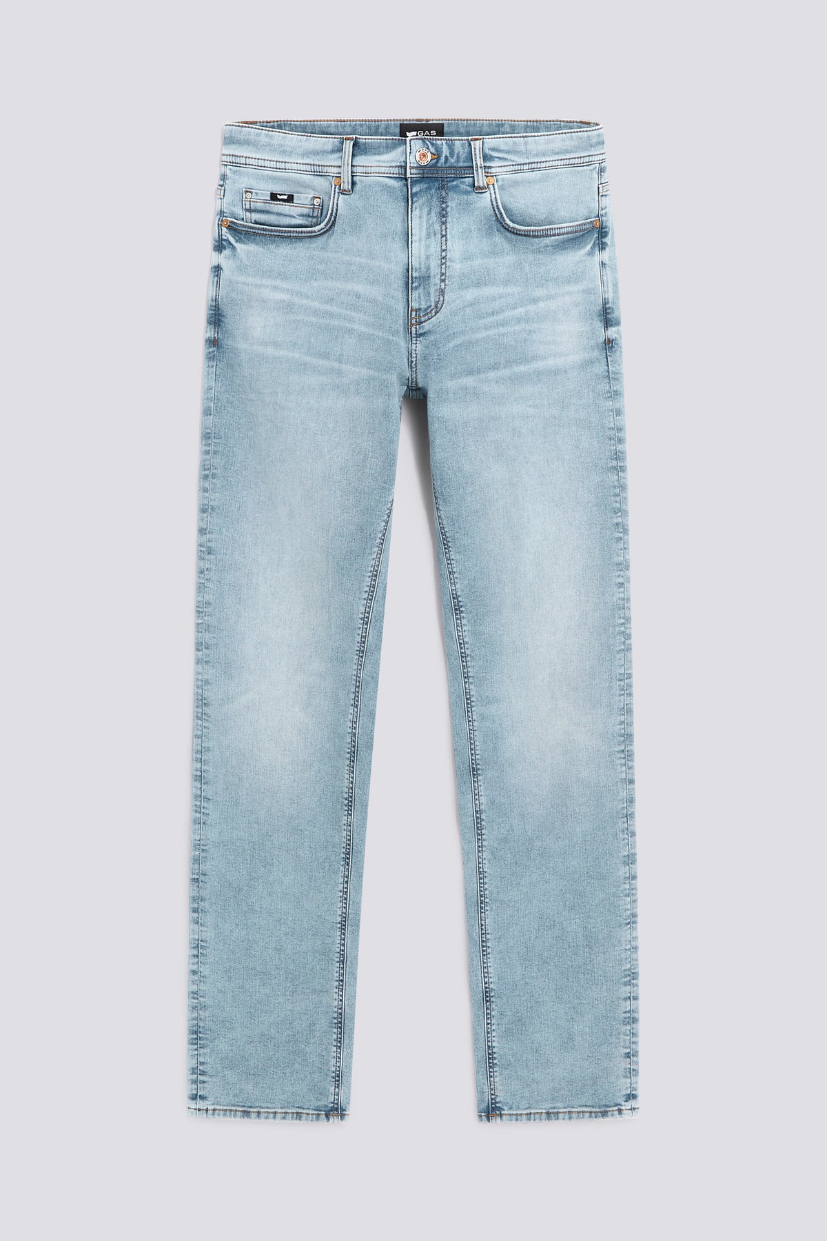 Men's five-pocket straight fit jeans in 10.50 oz stretch denim. The medium light stone wash features subtle abrasions on the pockets and hem, while the stretch denim follows the leg with a straight cut, ideal for everyday looks ranging from essential casual outfits to more refined pairings with shirts or lightweight jackets.