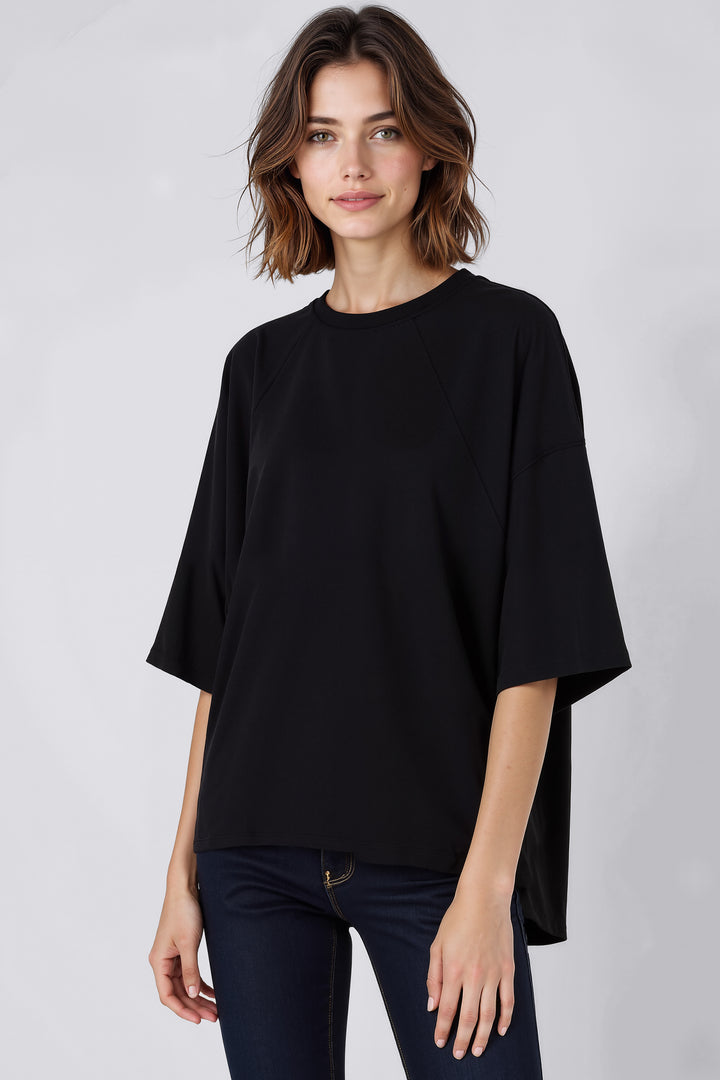Women's short-sleeve t-shirt, relaxed fit, made from a combination of fresh satin on the front and sleeves, and soft viscose jersey insert on the back and collar. An elegant and comfortable piece, personalized with a branded metal plaque on the back neckline. Perfect for a sophisticated yet relaxed look, combining refinement and comfort in one piece.