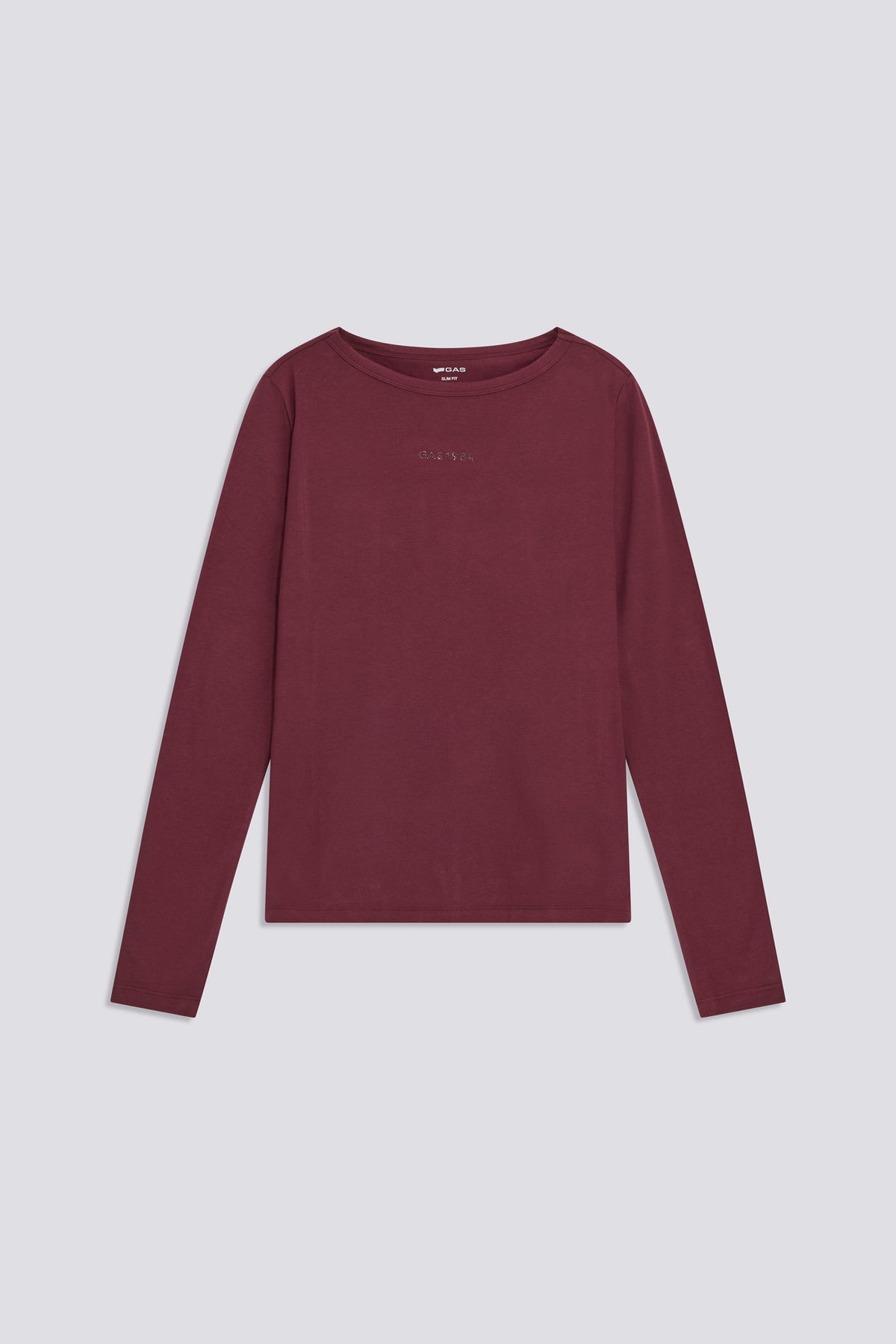 This long-sleeve t-shirt, made from stretch cotton jersey, is characterized by its slim fit and boat neckline. The rhinestone logo on the front adds a distinctive touch, perfect for completing looks with elegance. Ideal under a blazer or cardigan, or worn with a sporty outfit, it's a must-have for the female wardrobe.