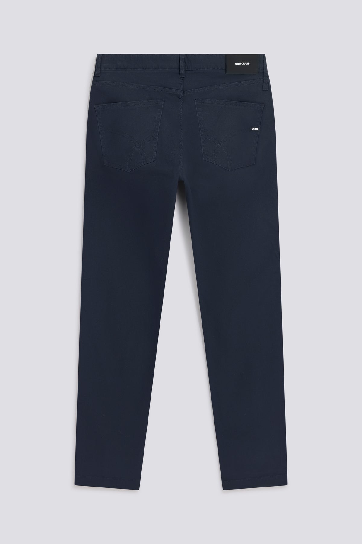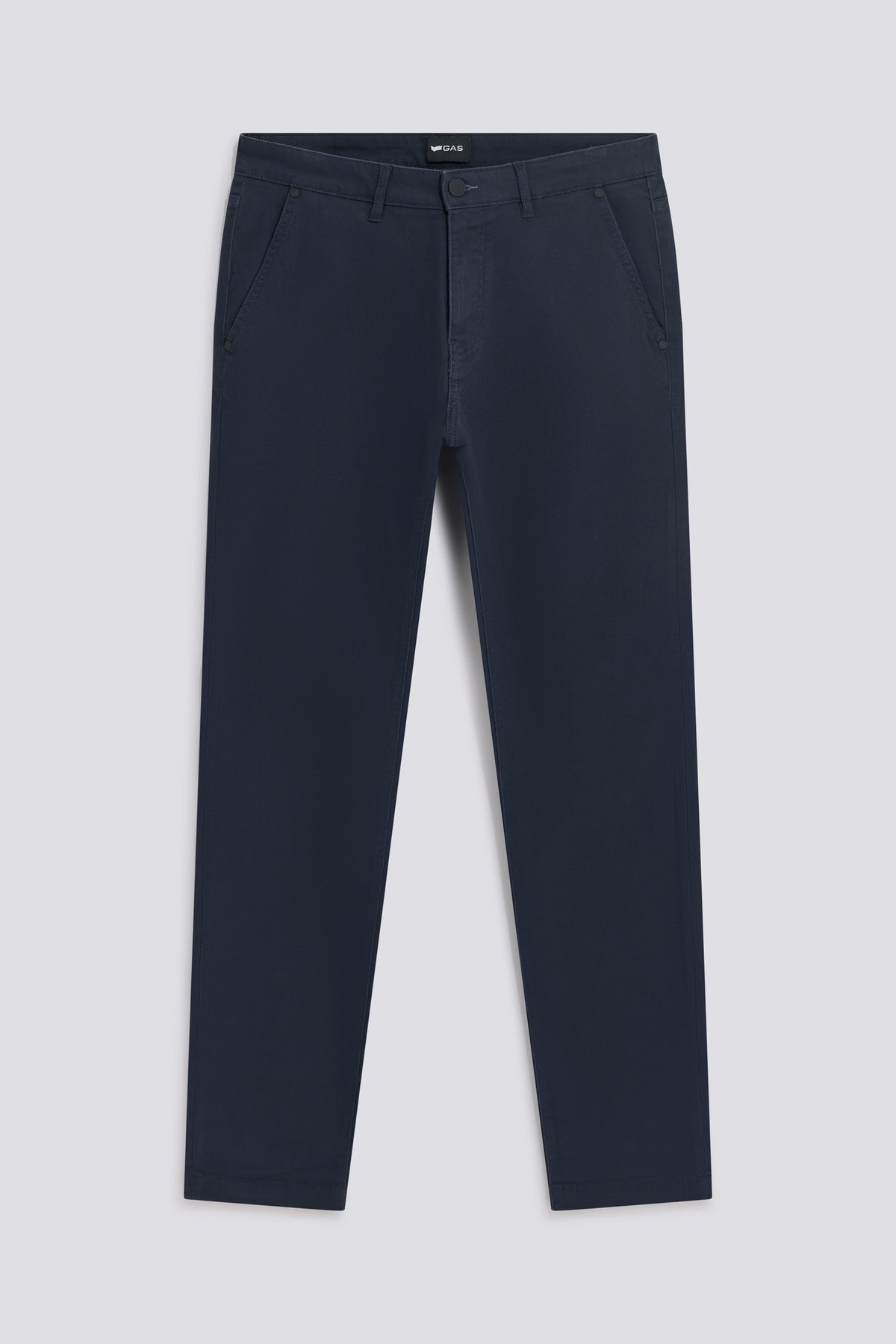 Men's chino cut pants, slim fit, made from stretch dobby cotton with a sophisticated texture. Clean lines and a sleek fit meet contrasting black rubber details, adding a contemporary and distinctive touch to this urban essential.