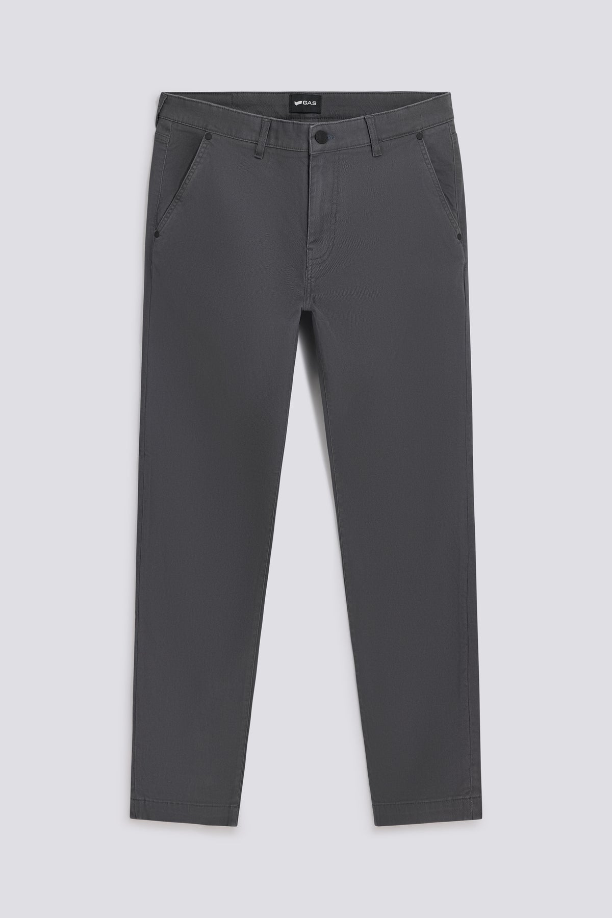 Men's chino cut pants, slim fit, made from stretch dobby cotton with a sophisticated texture. Clean lines and a sleek fit meet contrasting black rubber details, adding a contemporary and distinctive touch to this urban essential.