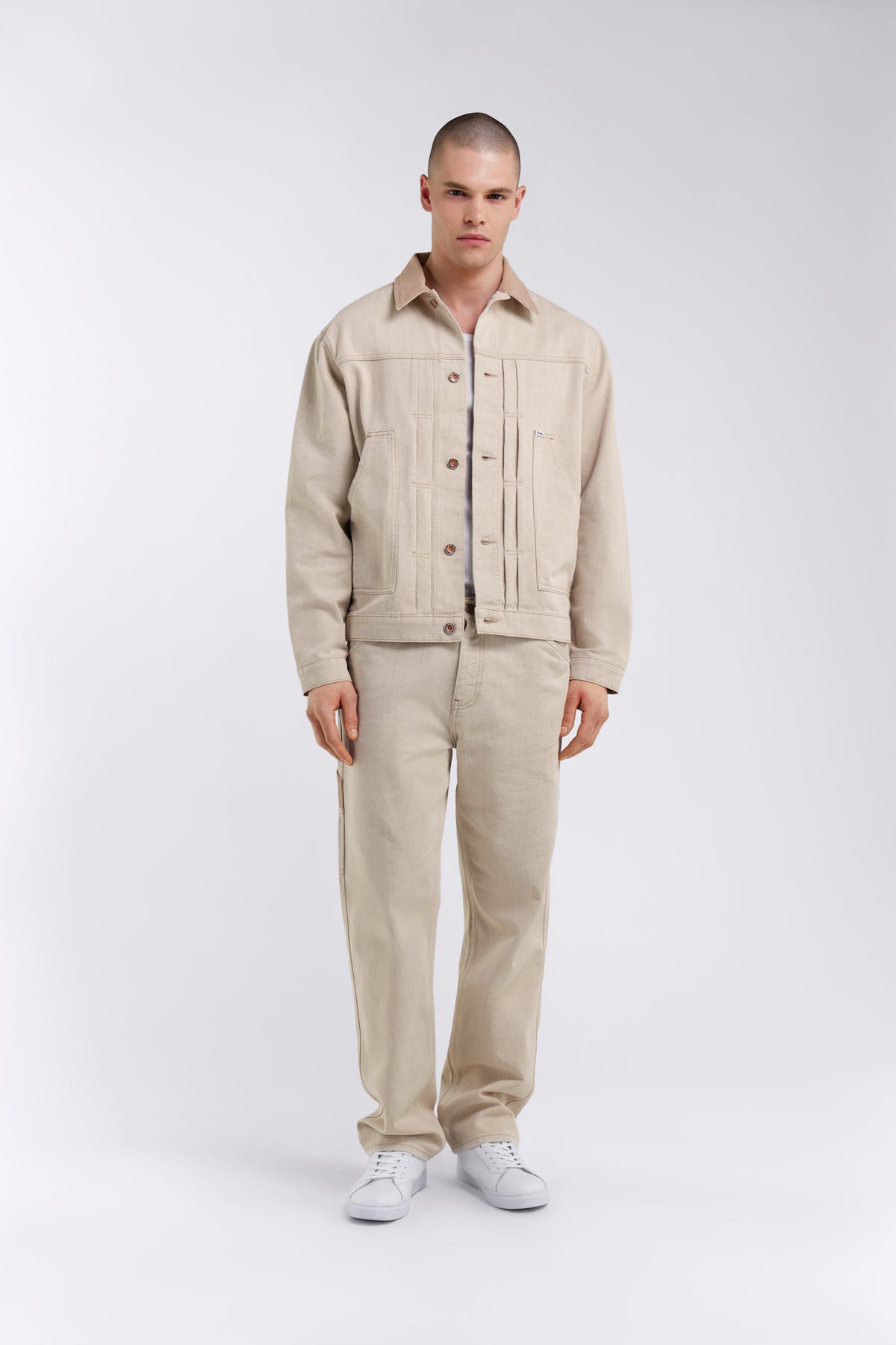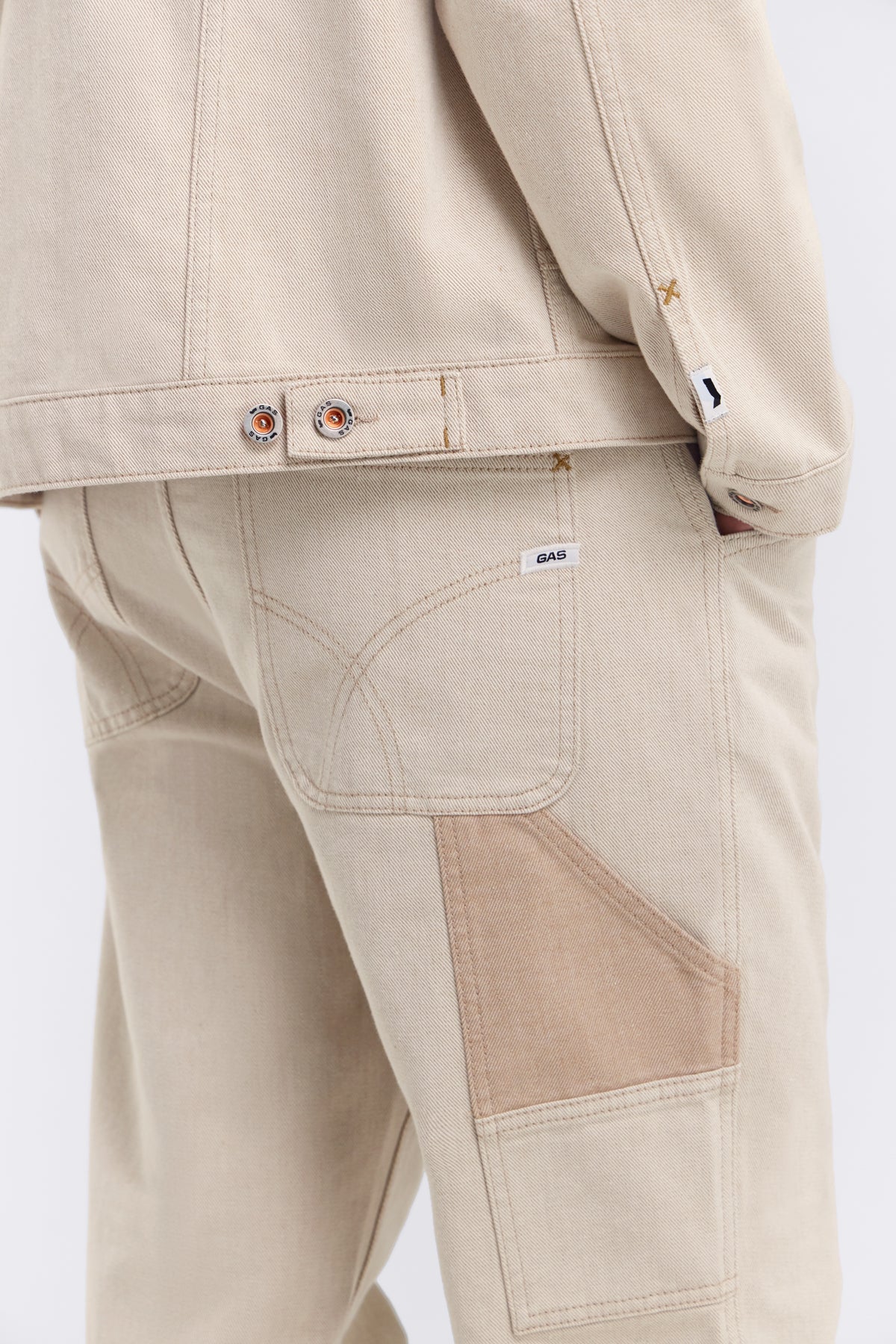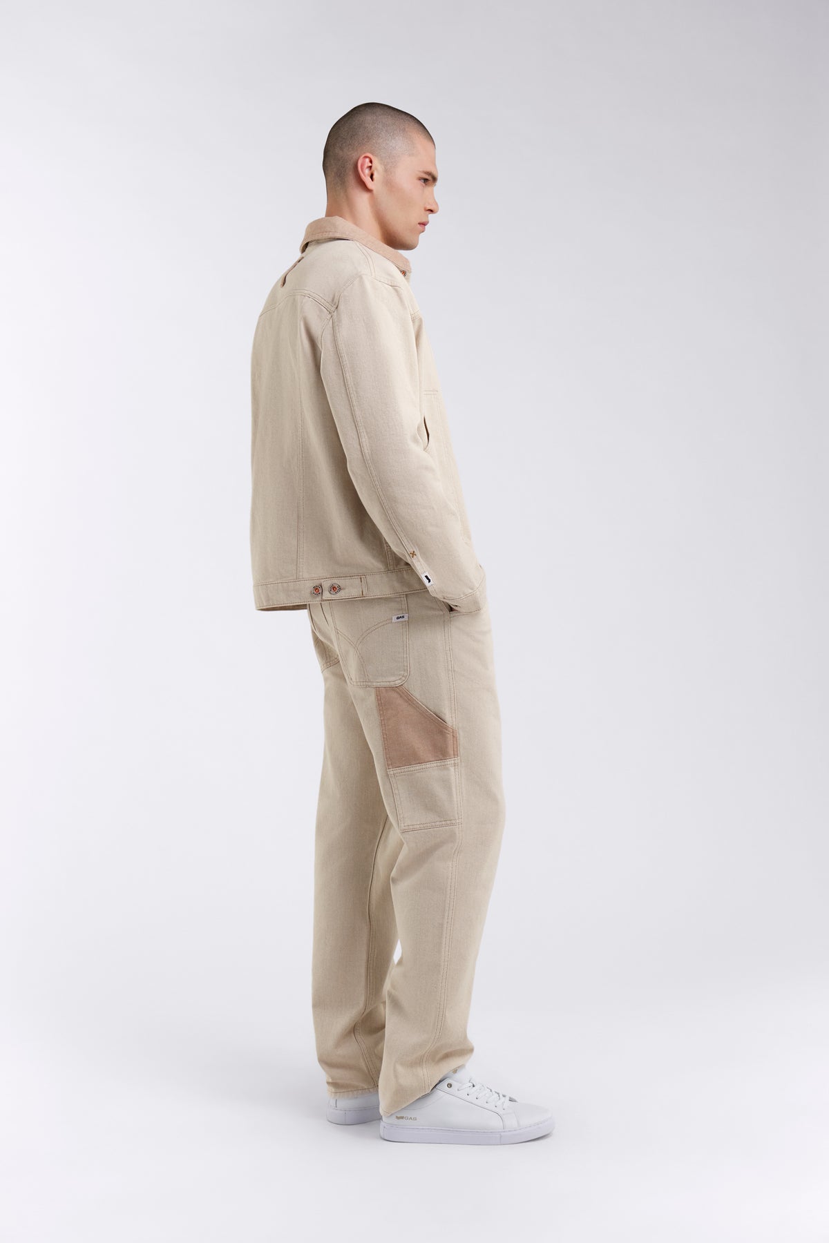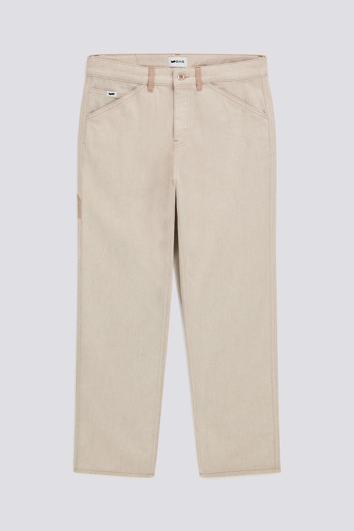 Workwear pants with a straight fit, designed to combine functionality and contemporary style. Made from 10.00 OZ bi-color stretch bull fabric, they ensure durability and comfort in any situation. The enzymatic wash gives them an authentic and slightly lived-in look, perfect for casual outfits with a utility twist. Ideal to pair with a t-shirt for a relaxed look or with a shirt for a more refined vibe.