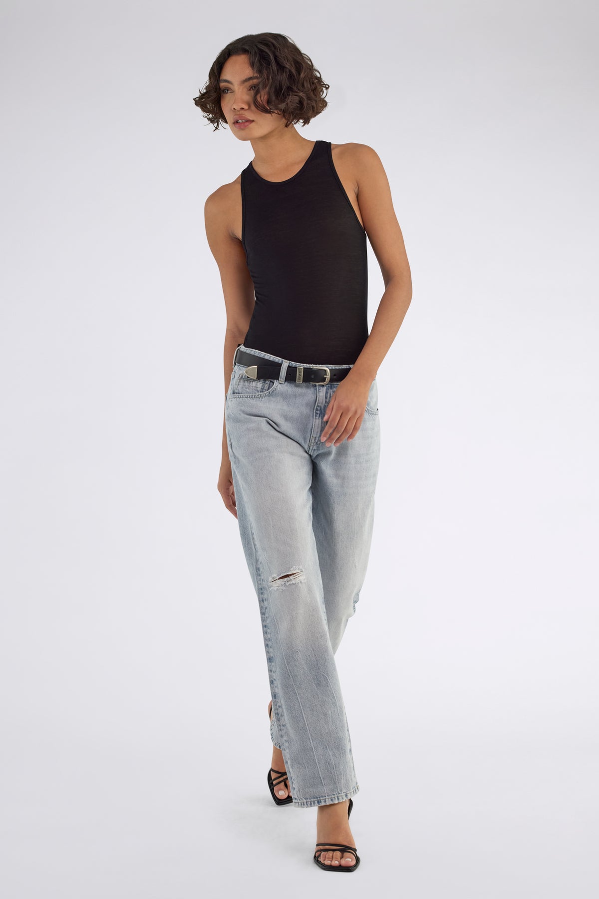 Women's 5-pocket straight fit jeans in fixed grey cast denim, 11.0 oz. The medium-light stone wash enhances the unique grey shade, complemented by destroyed details for a bold, contemporary look. The straight fit keeps the leg line clean, making this style ideal for essential outfits with character, whether paired with minimal tops or more structured pieces for a trendy contrast.