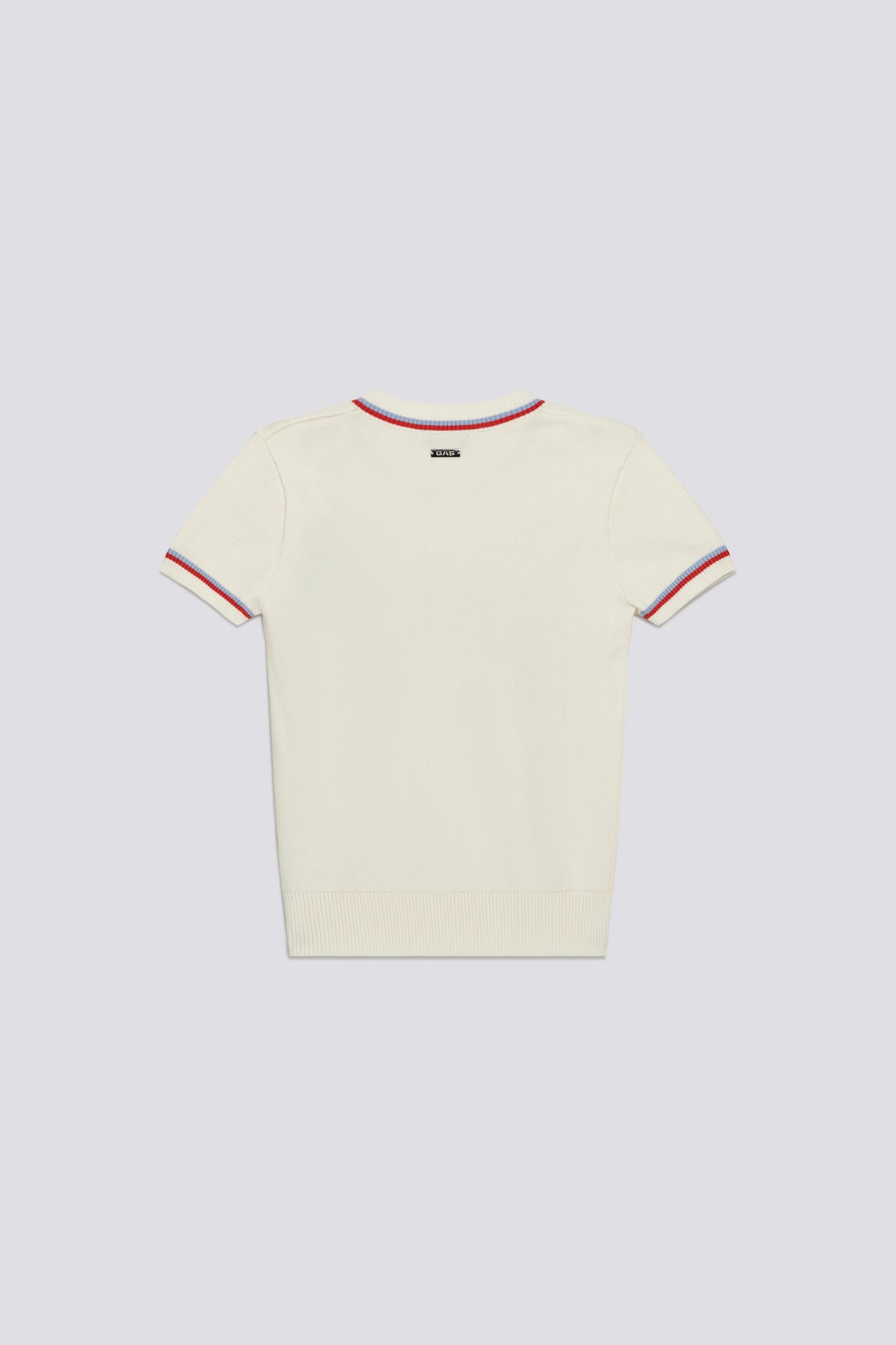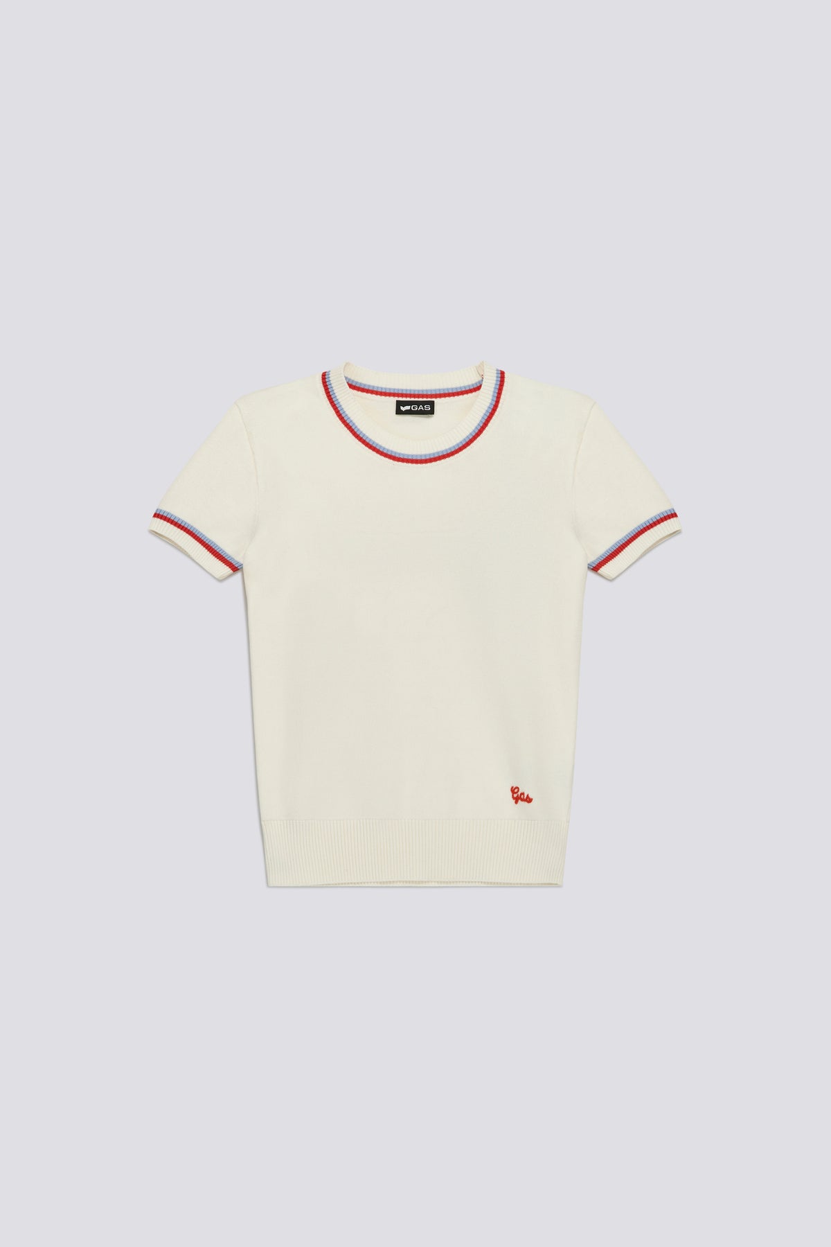 Women's crew neck short-sleeve slim fit sweater in fine 12-gauge viscose yarn. The striped trim on the collar and sleeve cuffs adds a heritage-inspired graphic accent, making this piece instantly recognizable. The slim fit creates a streamlined look, while the lightweight yarn makes it ideal for refined yet relaxed summer outfits, worn with denim, tailored pants, or under a light jacket.