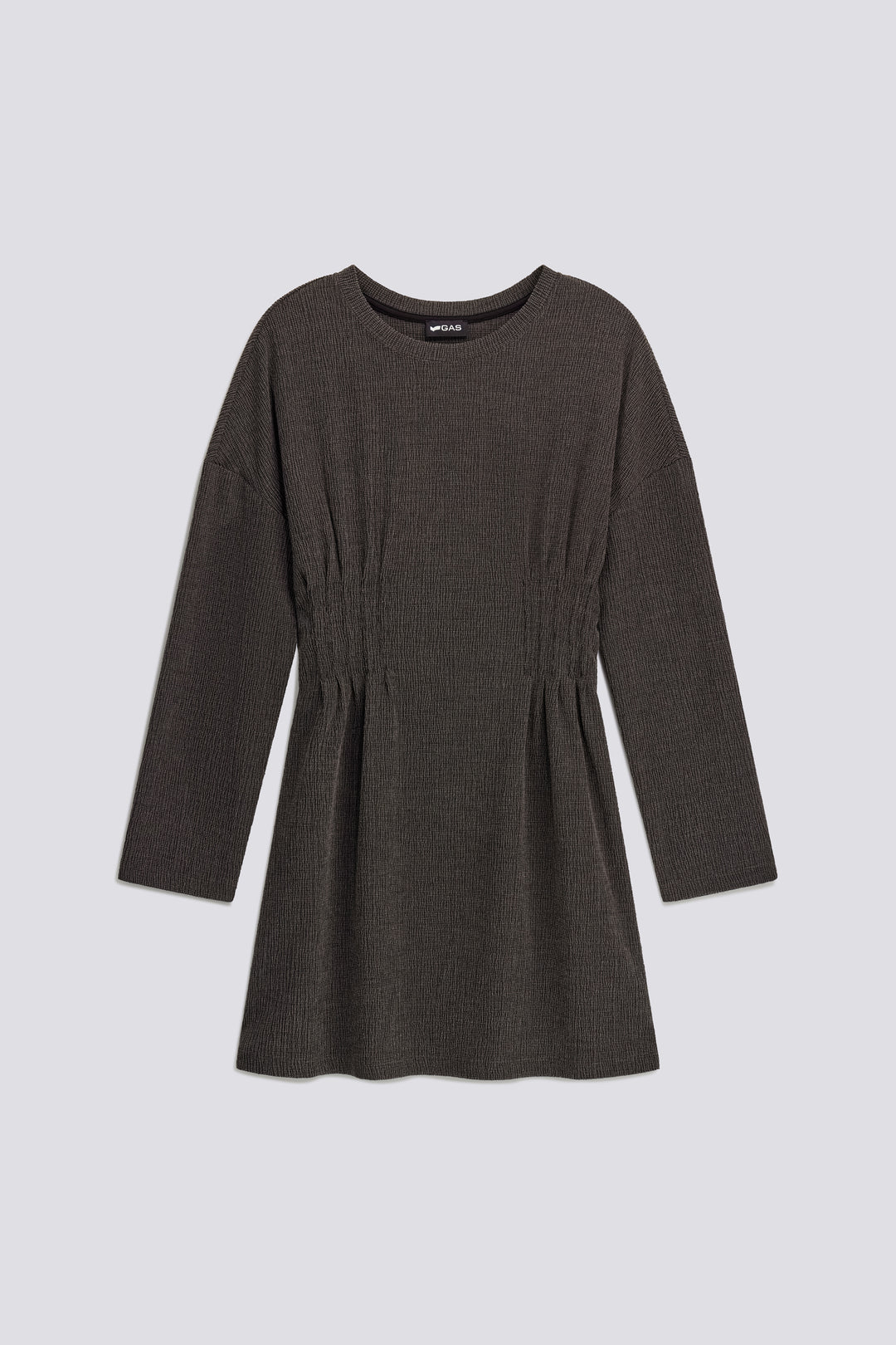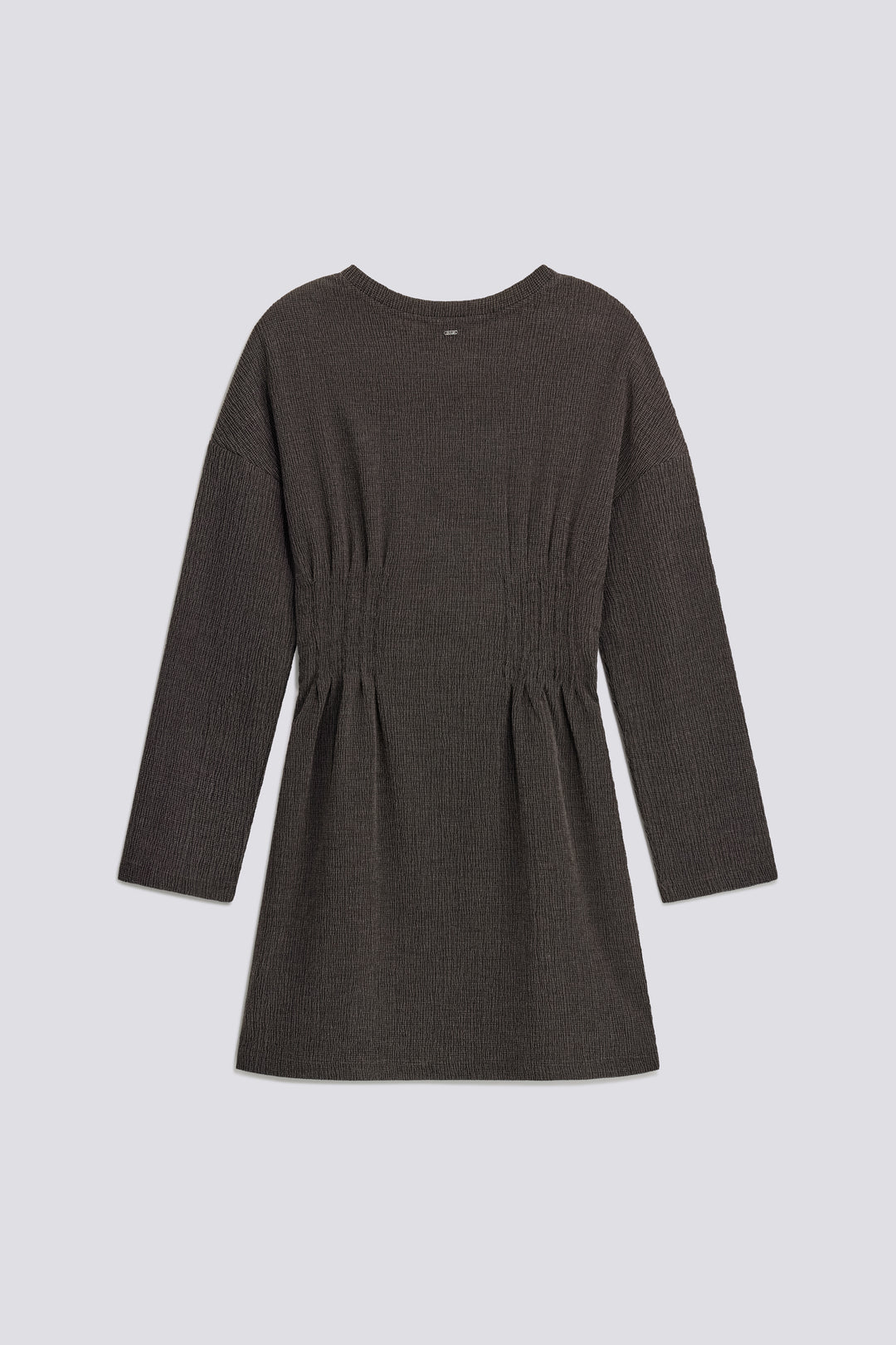 Long-sleeve fitted dress enhanced by pinces at the waist that accentuate the silhouette. Made from embossed jersey with a washed effect, it combines clean lines with a hyper-feminine allure. The metallic logo plaque on the back neckline adds a distinctive detail.