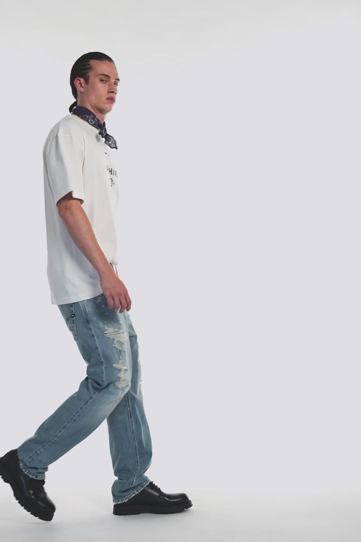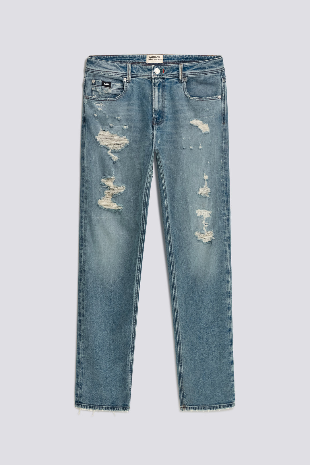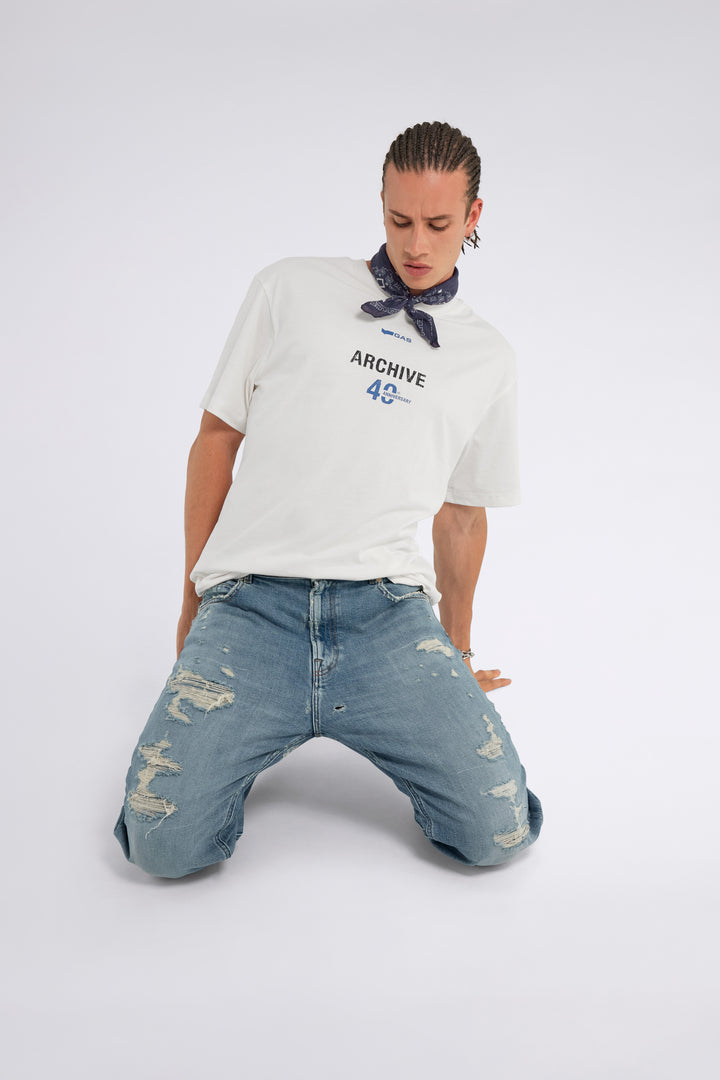 Men's 5-pocket denim, Made in Italy, loose fit – a true urban statement. Crafted from comfort fabric with an authentic look at 11.05 OZ, this piece is distinguished by a genuine light blue pumice wash enriched with extra distressing and patches that amplify its character. Rugged and cool, it's a must-have for those who want to stand out with a bold, timeless look.