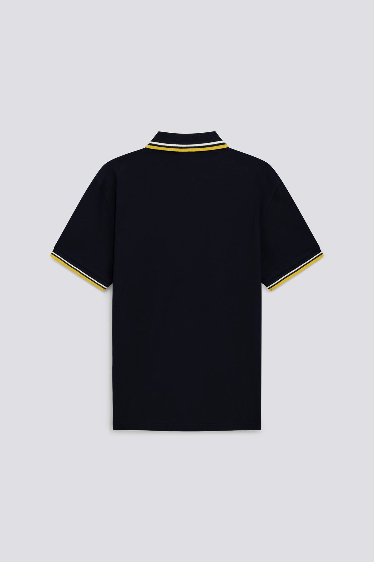 Men's short sleeve slim fit polo in stretch piqué. The ribbed collar and cuffs in contrasting stripes evoke a sport heritage aesthetic, while the embossed logo print on the chest adds an essential graphic touch. A timeless staple in men's wardrobes.