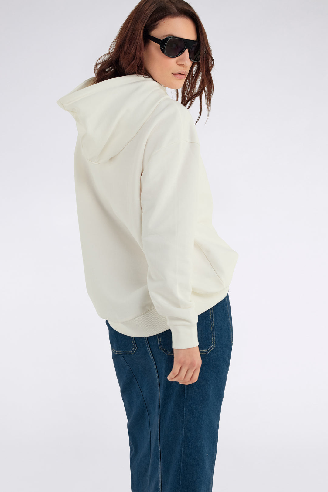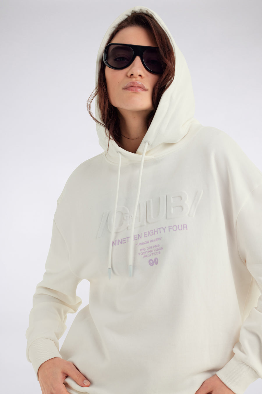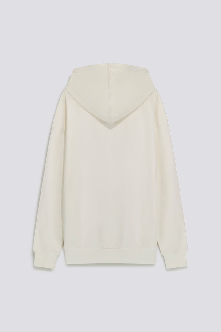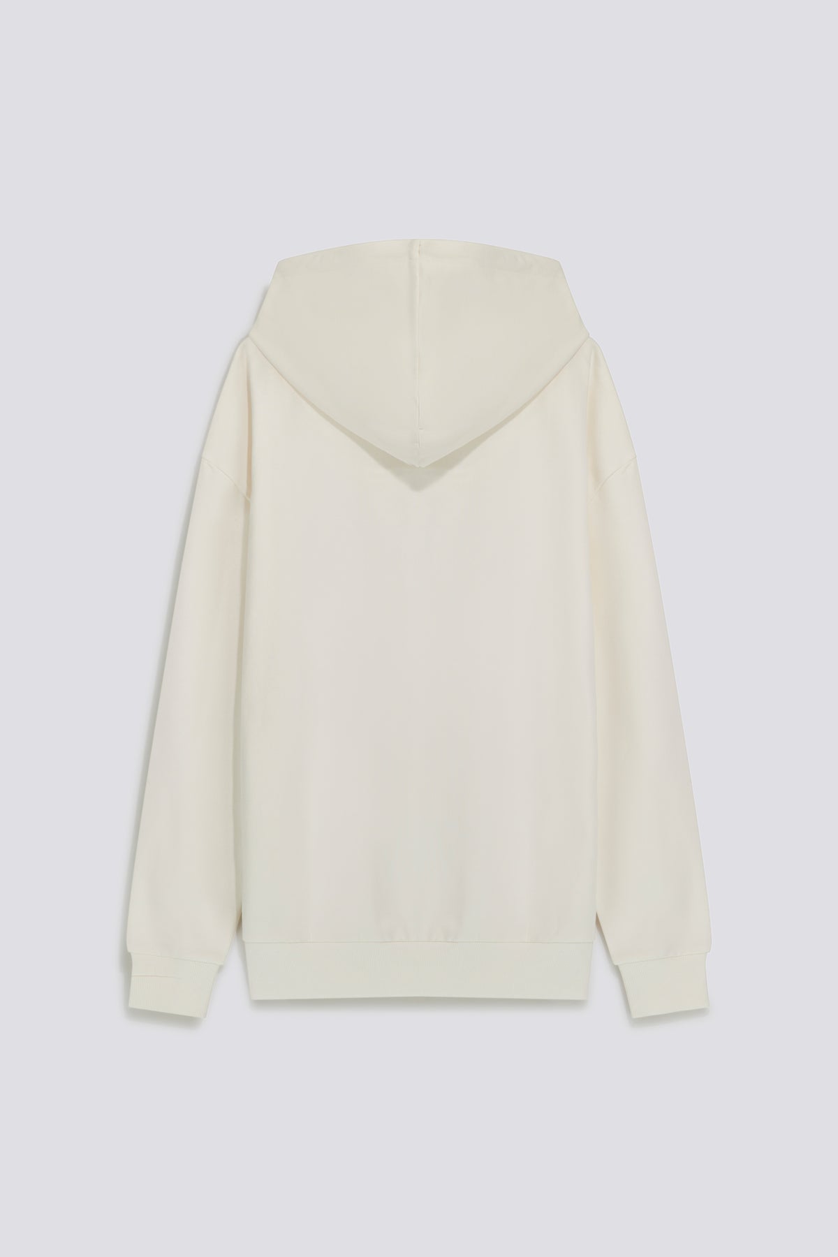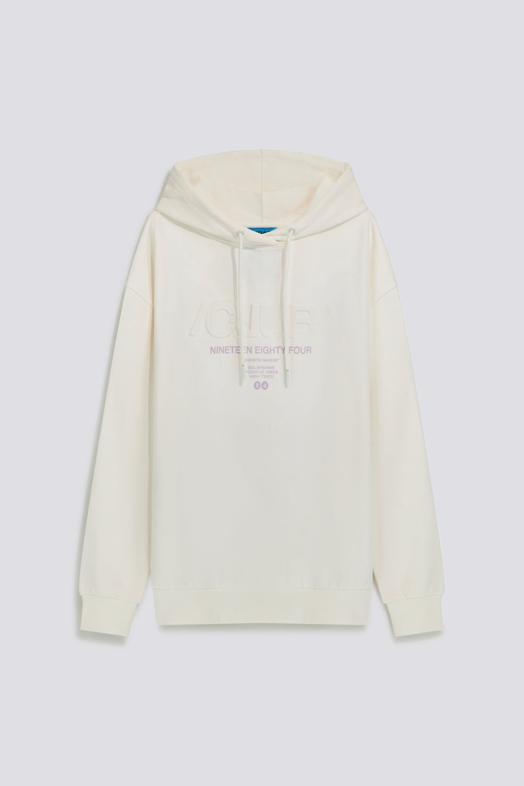 Relaxed fit hoodie, crafted from diagonal cotton fleece for unique comfort and a contemporary style. The water-based and embossed contrasting print on the front adds character to this piece, perfect for a trendy urban look.