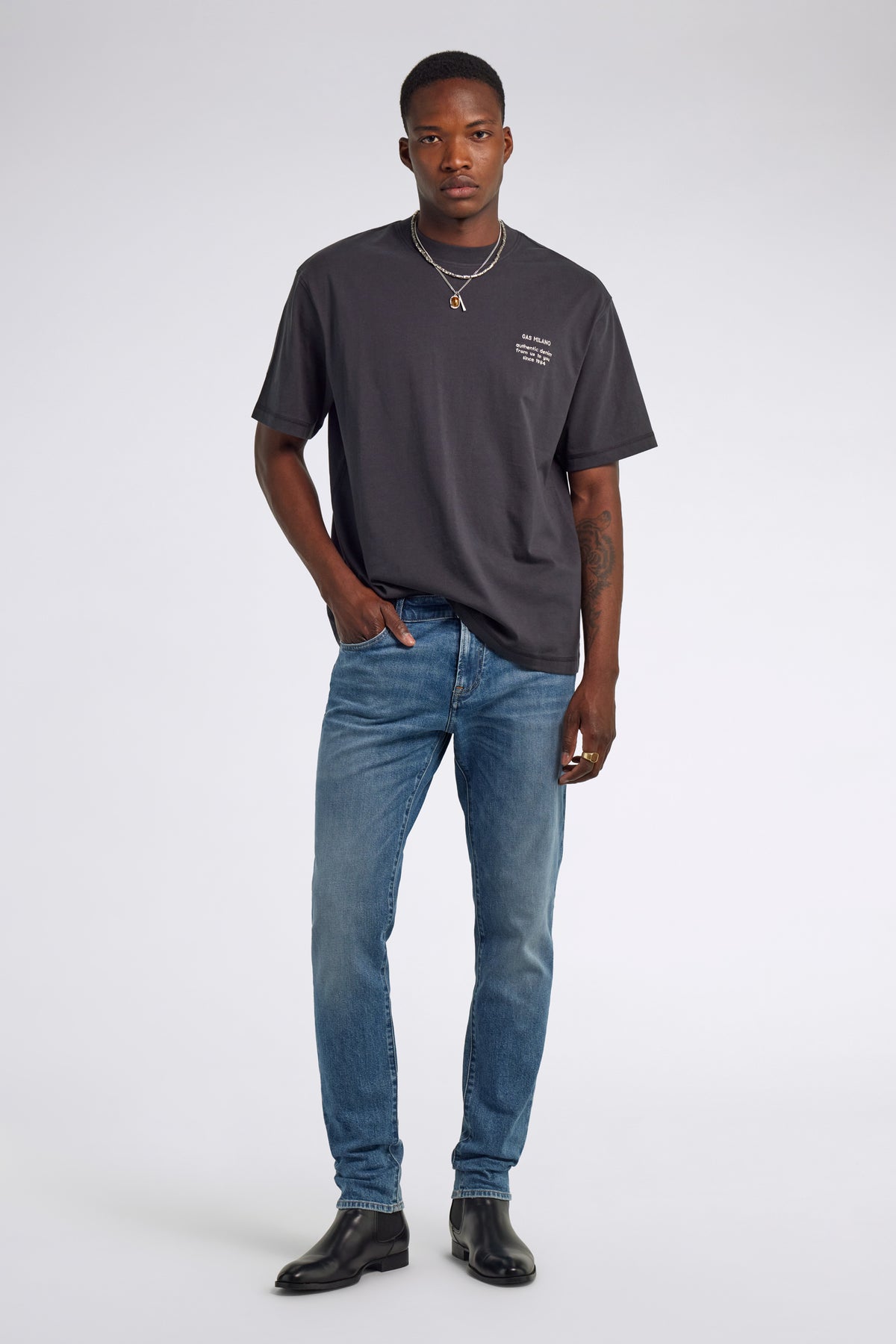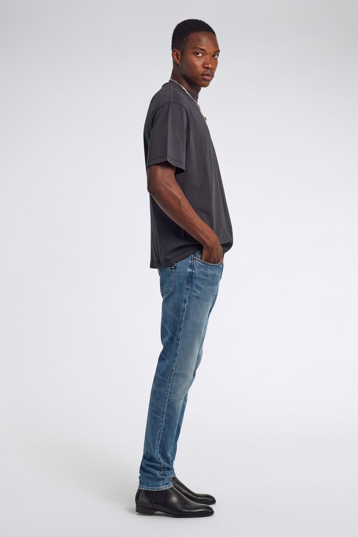 Jean homme 5 poches skinny fit en tissu denim bleu indigo comfort 10,00 oz. Le lavage à la pierre ponce de densité moyenne avec moustaches 3D définit le vêtement, le rendant idéal pour un usage quotidien et pour des looks essentiels à l’allure affirmée.