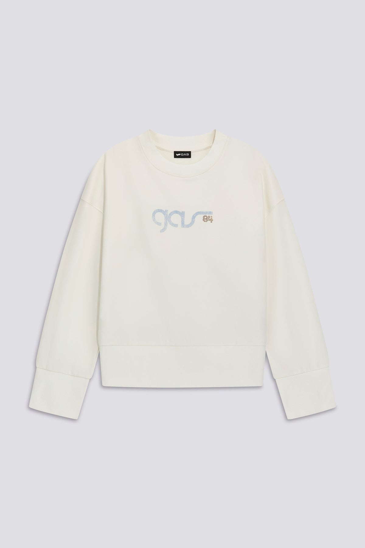 Sweat-shirt femme à col rond, coupe confort, en molleton diagonal 100% coton. Le logo “GAS 84” imprimé à l’eau au centre du devant est rehaussé de micro strass, pour un contraste équilibré entre style casual et détail féminin. Un vêtement qui associe héritage et modernité, conçu pour apporter du caractère même aux looks les plus essentiels.